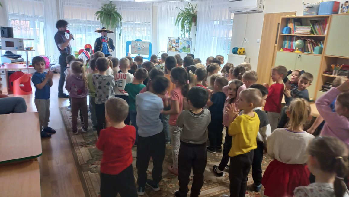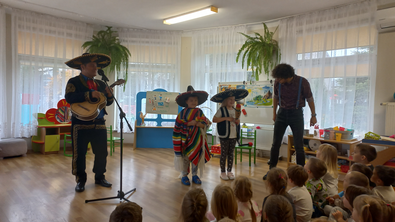 Kolejny raz odwiedzili nas muzycy z filharmonii łódzkiej oraz gość z dalekiego Meksyku. Dowiedzieliśmy się różnych ciekawostek na temat muzyki i potraw meksykańskich. Nauczyliśmy się także układu do piosenki La cucaracha. Podziwialiśmy piękny meksykański strój naszego gościa i ogromne sombrero, które w warunkach naturalnych chroni przed upalnym słońcem.