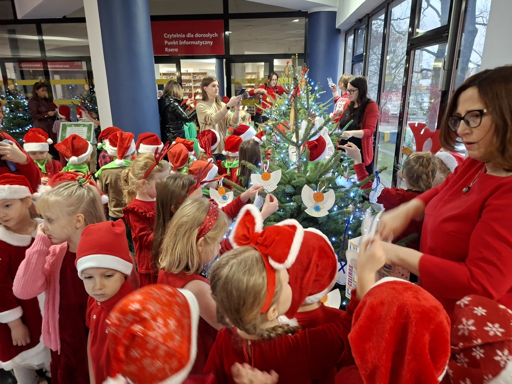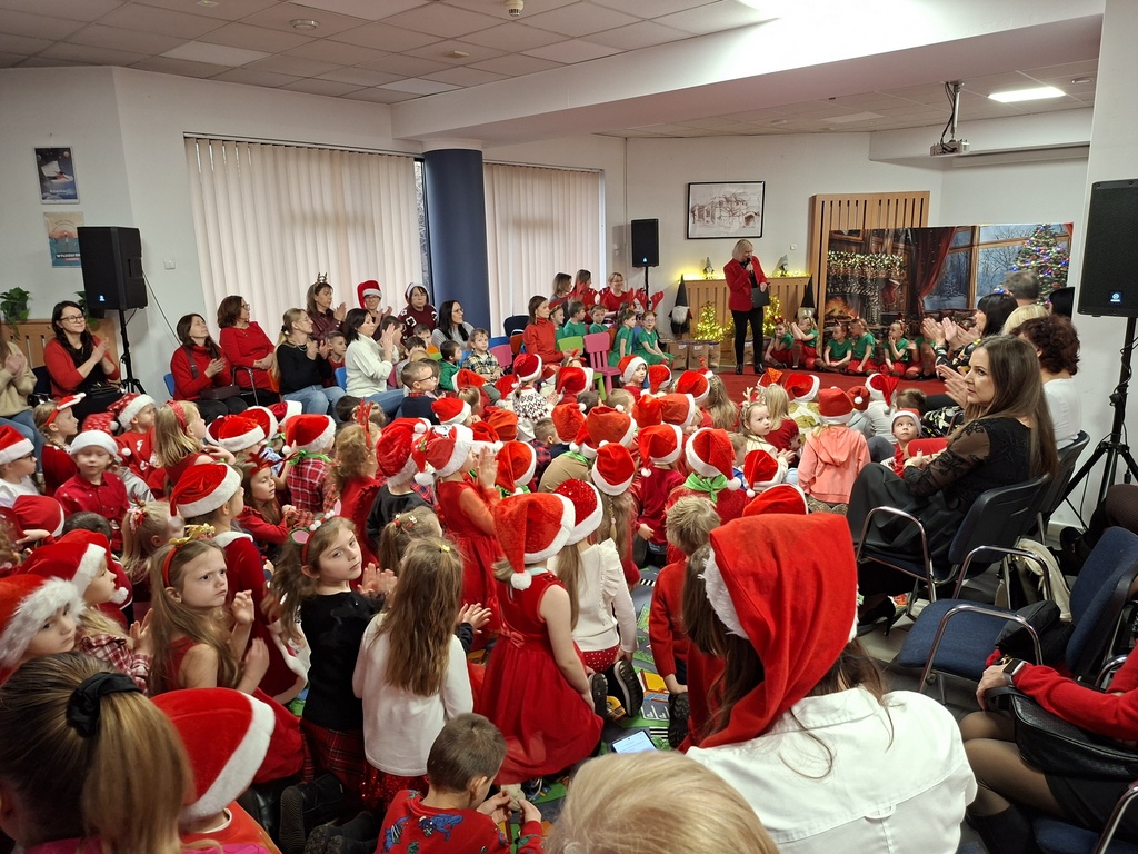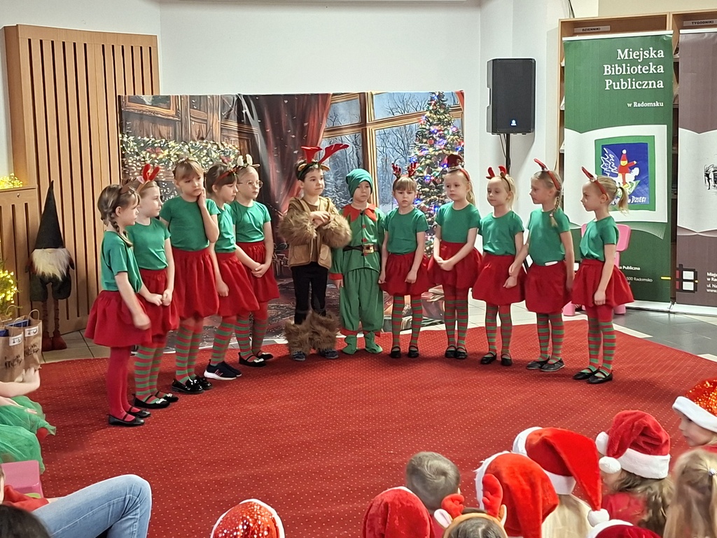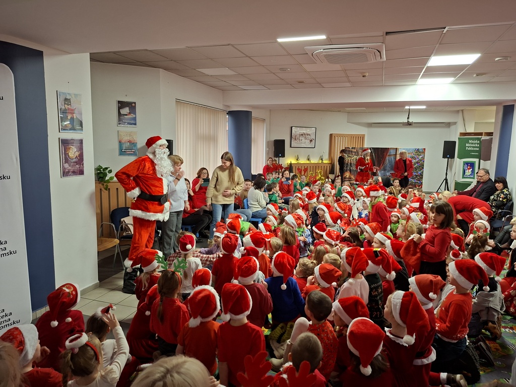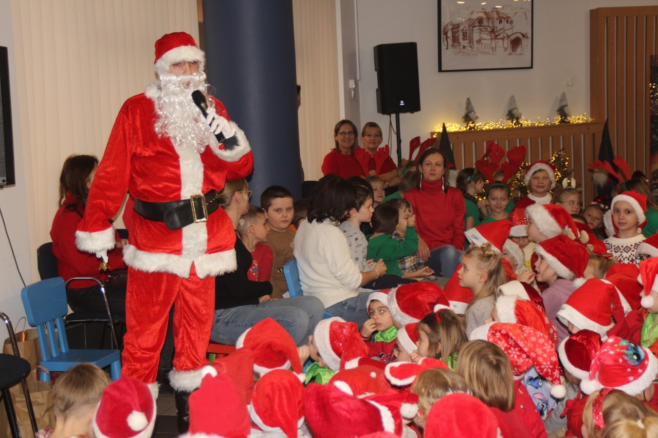 Jak co roku Miejska Biblioteka Publiczna w Radomsku we współpracy z naszym przedszkolem zorganizowała spotkanie ze Świętym Mikołajem. W piątek 5 grudnia w bibliotece pojawiły się maluchy ze wszystkich radomszczańskich przedszkoli. To zabawa, którą organizujemy już od kilku lat. Dla dzieci przygotowujemy wówczas niespodziankę- wizytę Świętego Mikołaja ze Śnieżynką! Prezenty otrzymują wszystkie dzieci. Wcześniej jednak przedszkolaki ozdabiały choinki własnoręcznie przygotowanymi ozdobami. Każde przedszkole miało swoje drzewko. Następnie przed swoimi rówieśnikami w krótkim mikołajkowym przedstawieniu pt. ”Chory Mikołaj” zaprezentowały się pięknie dzieci z naszego kółka teatralnego zbierając zasłużone oklaski. Burza oklasków wybuchła też na widok Świętego Mikołaja, który przywitał się z maluchami, pogawędził z nimi i rozpoczął rozdawanie prezentów!