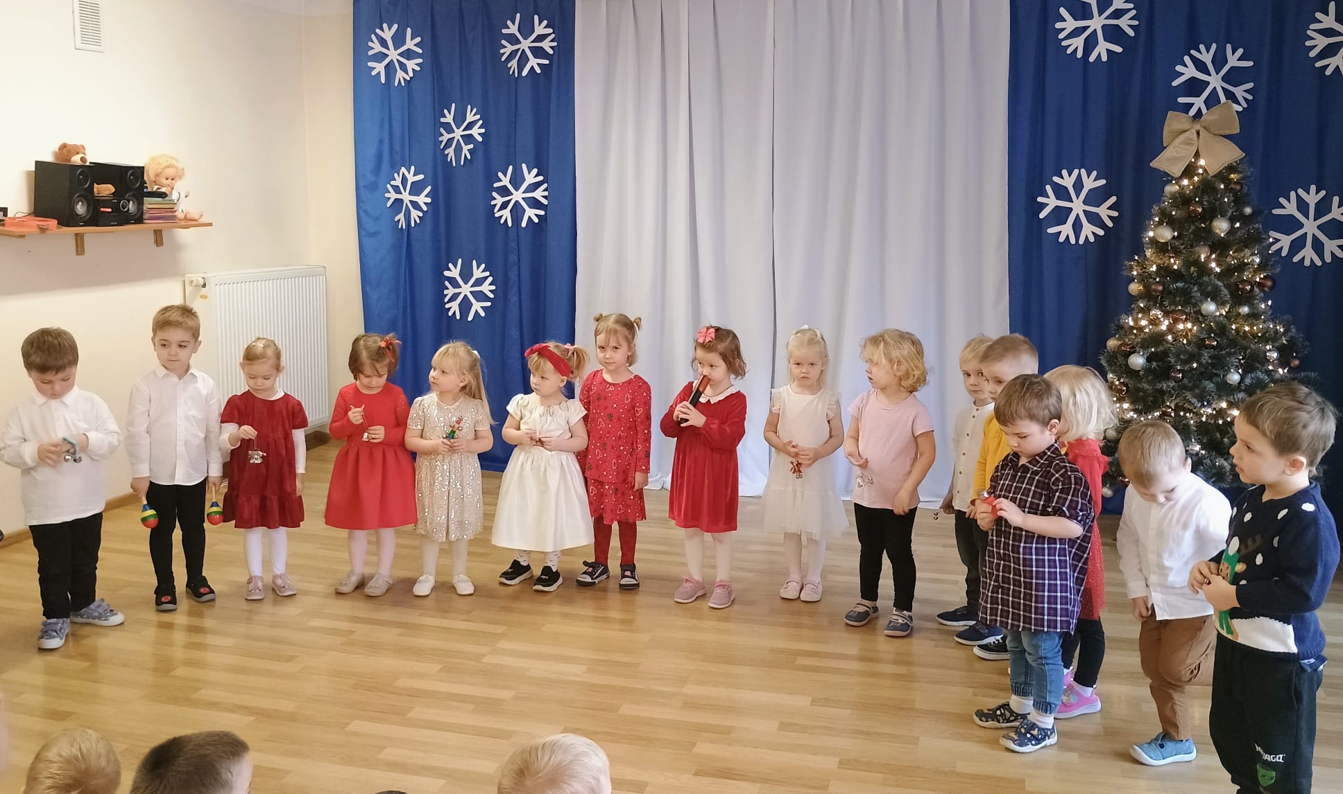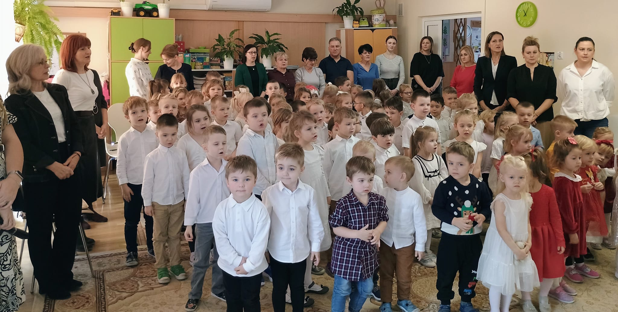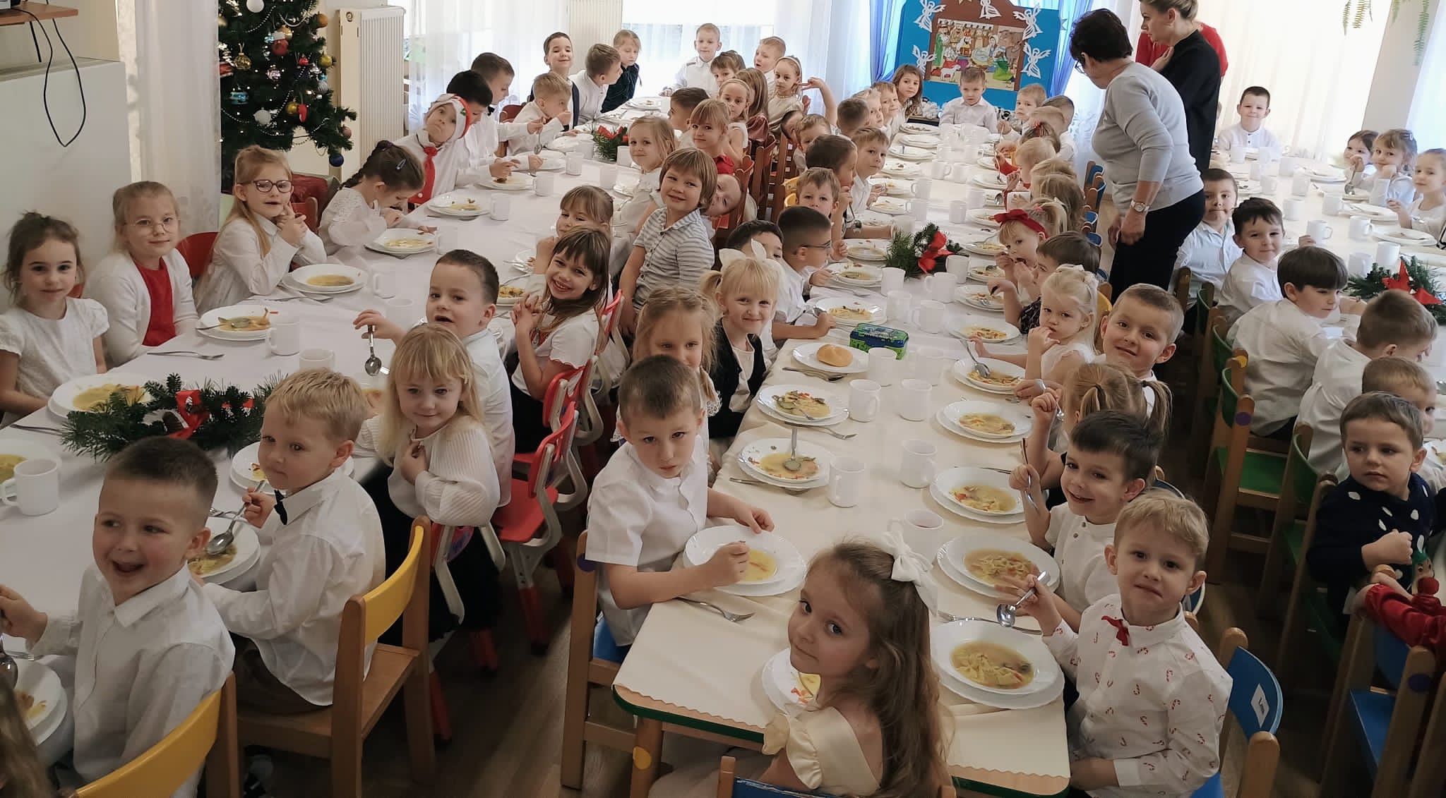 Wigilia to jeden z najpiękniejszych dni w roku, na który czekamy z niecierpliwością i przeżywamy go uroczyście. W naszym przedszkolu dzieci co roku poznają tradycje i zwyczaje świąteczne oraz chętnie uczestniczą w bożonarodzeniowych przygotowaniach. W dniu dzisiejszym w całym przedszkolu panowała radosna, ożywiona atmosfera. Świąteczne dekoracje oraz dzieci w odświętnych strojach wprowadzały nastrój oczekiwania na wyjątkowe, niecodzienne wydarzenia. Jagódki przygotowały dla wszystkich piękne kolędy i wierszyki, a dzieci z poszczególnych grup śpiewały kolejno kolędy. Po występie Pani Dyrektor złożyła wszystkim obecnym najlepsze życzenia. Przedszkolaki i pracownicy wspólnie zjedli tradycyjny wigilijny obiad. Wszystkie dzieci czuły zbliżające się wielkimi krokami Święta Bożego Narodzenia. Pięknych i zdrowych świąt!