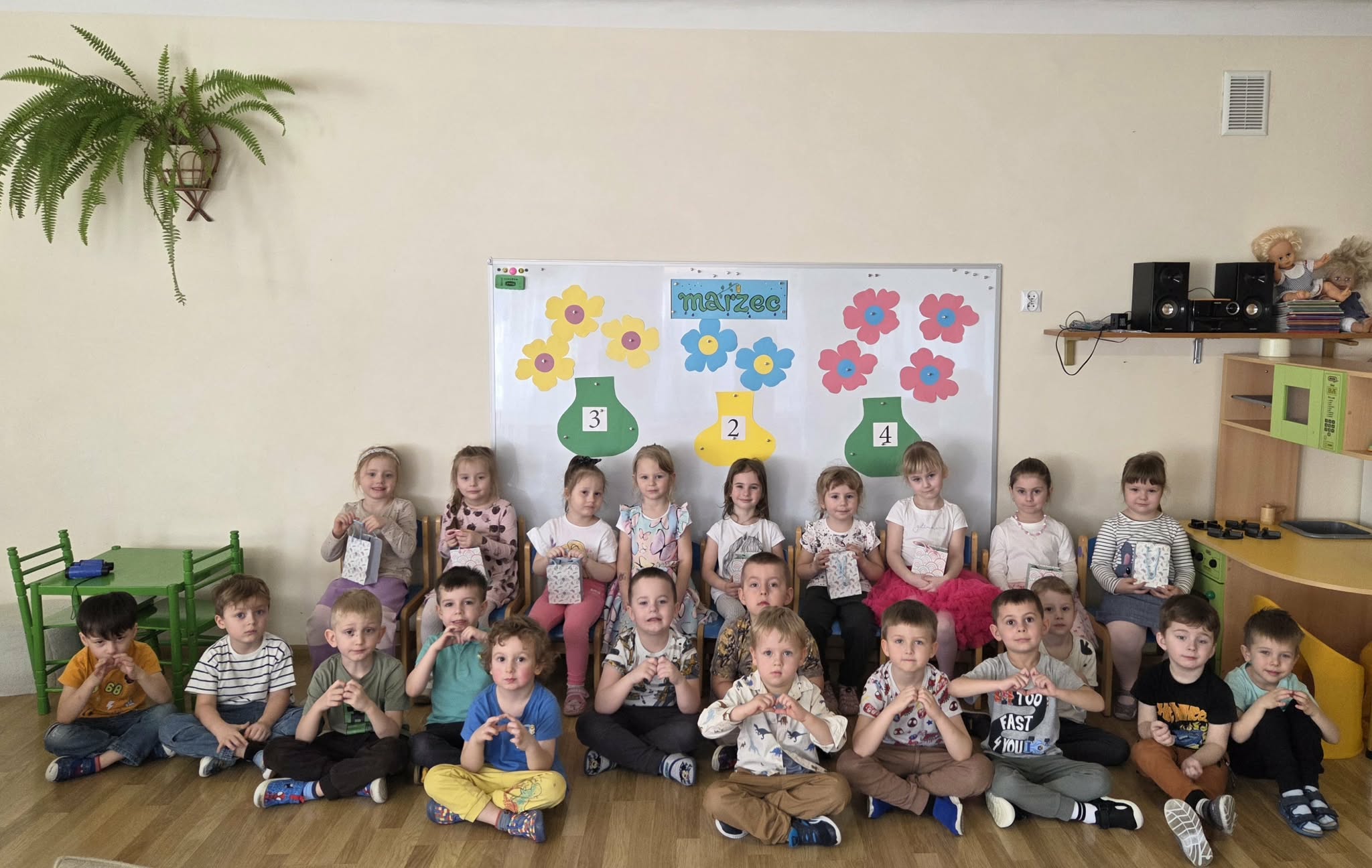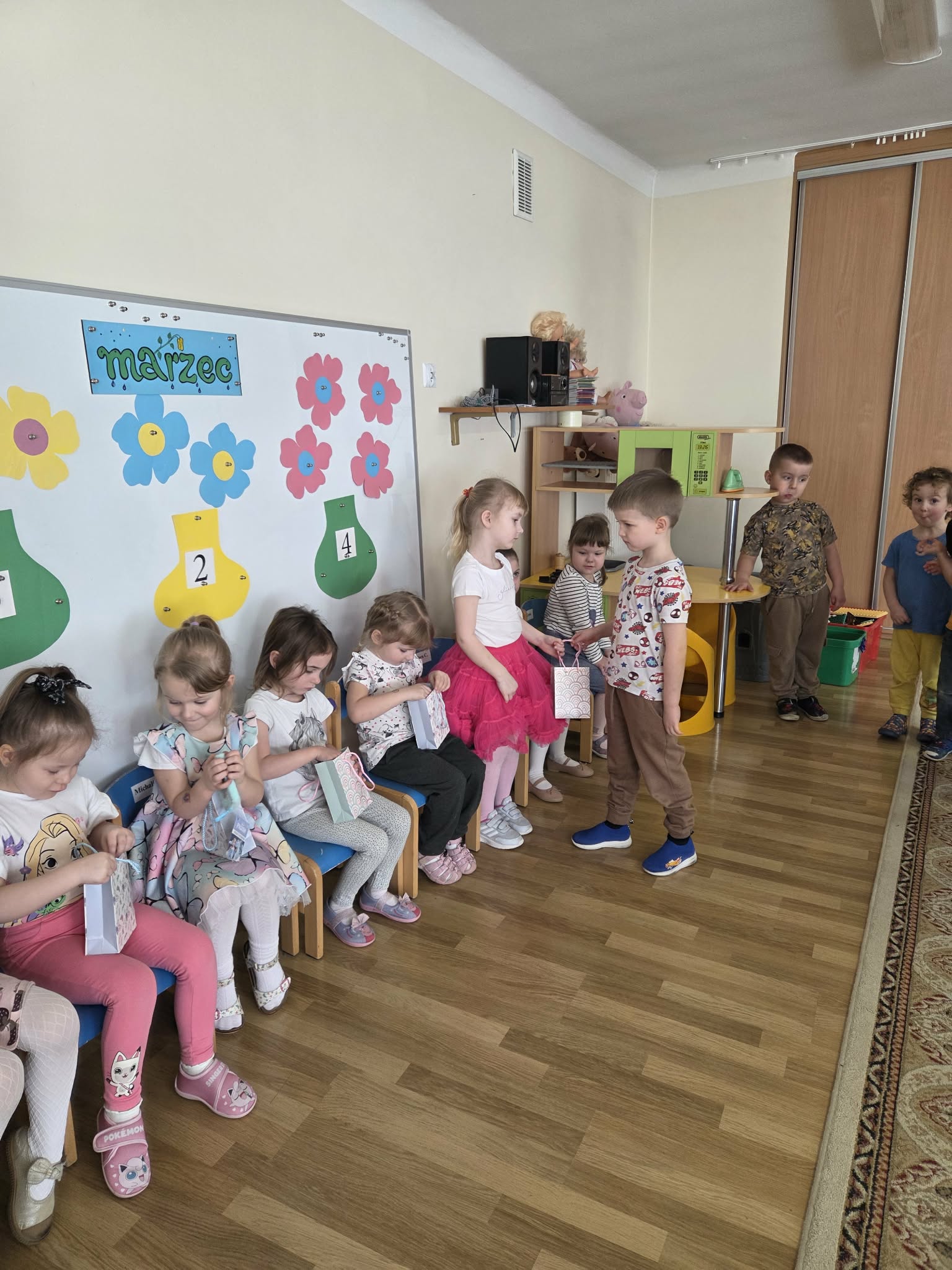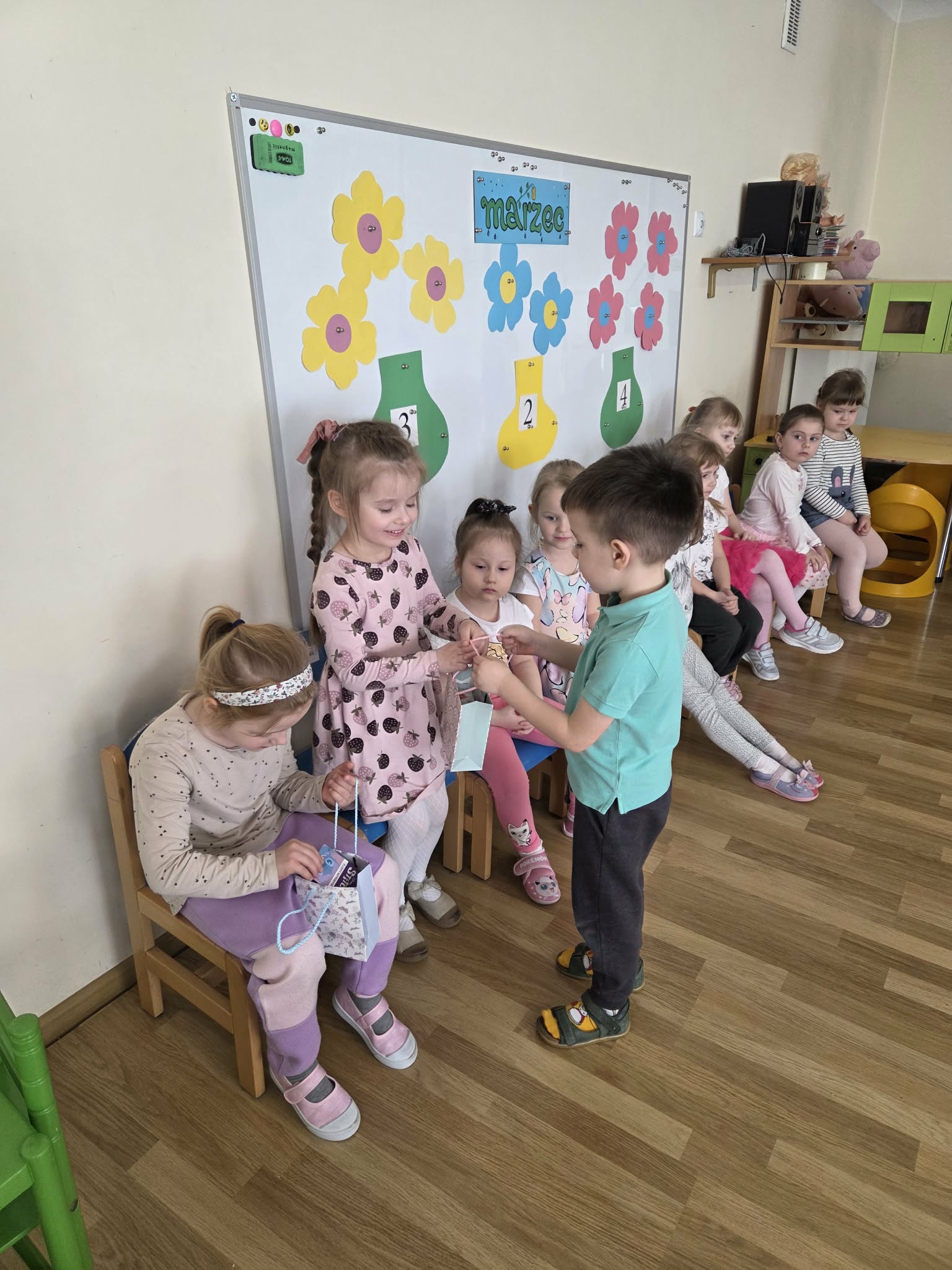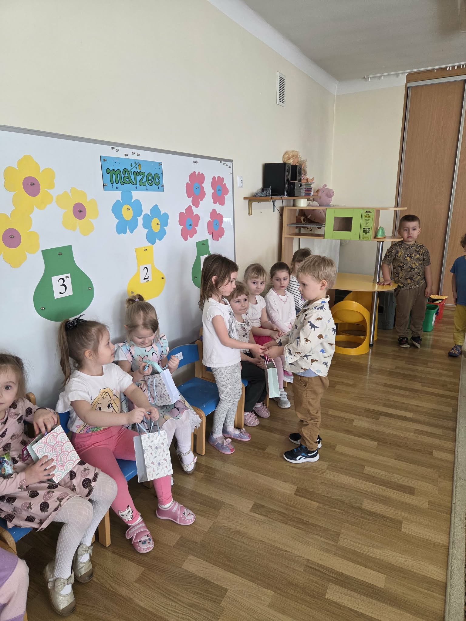 Święto Kobiet, które corocznie obchodzimy w naszym przedszkolu, to doskonały sposób do kształtowania u dzieci nawyku obdarowywania upominkami swoich najbliższych. Wszystkie kobietki, te małe i duże dziękują chłopcom za piękne życzenia.