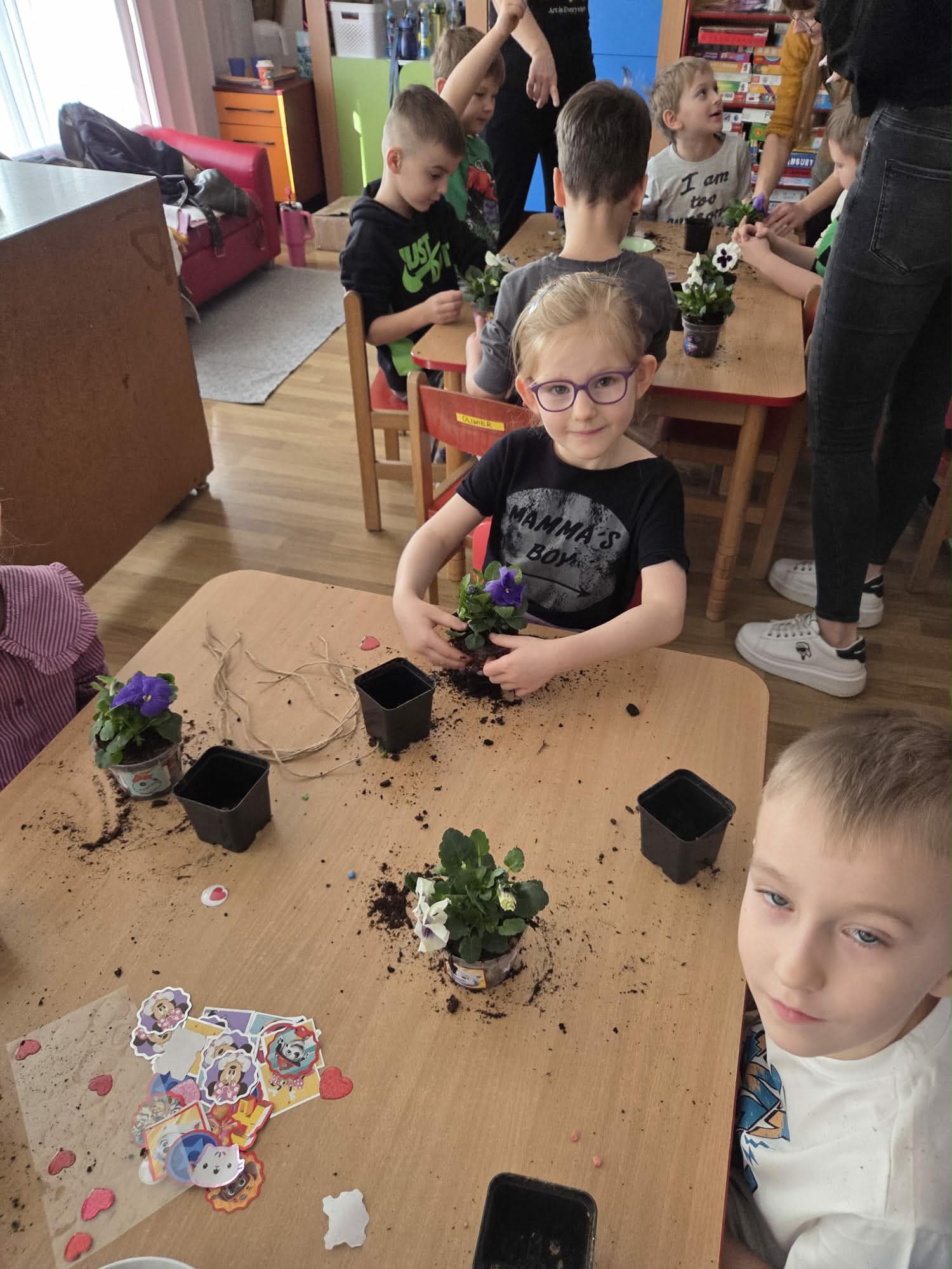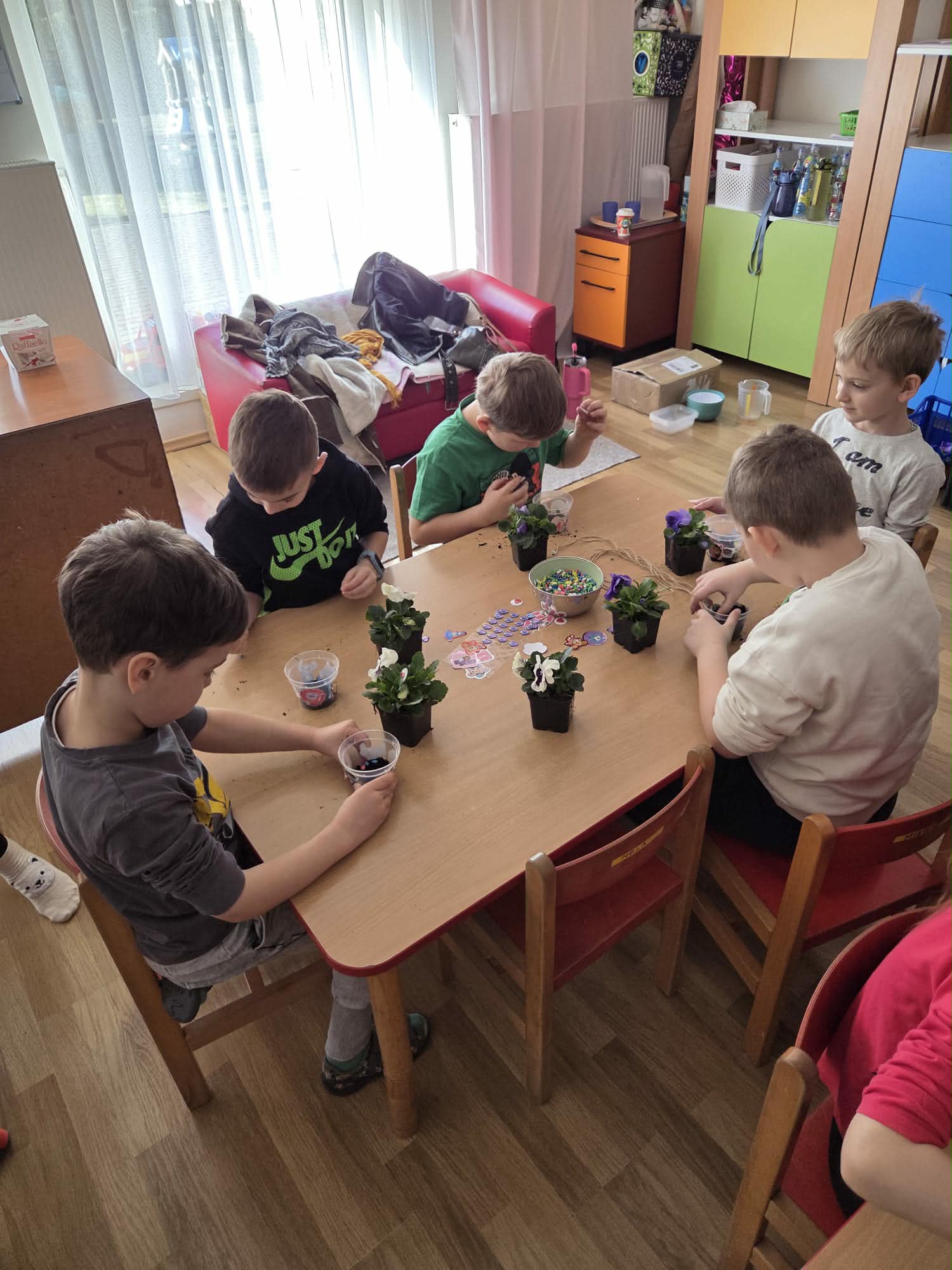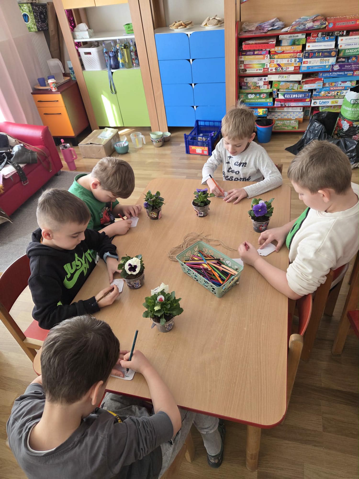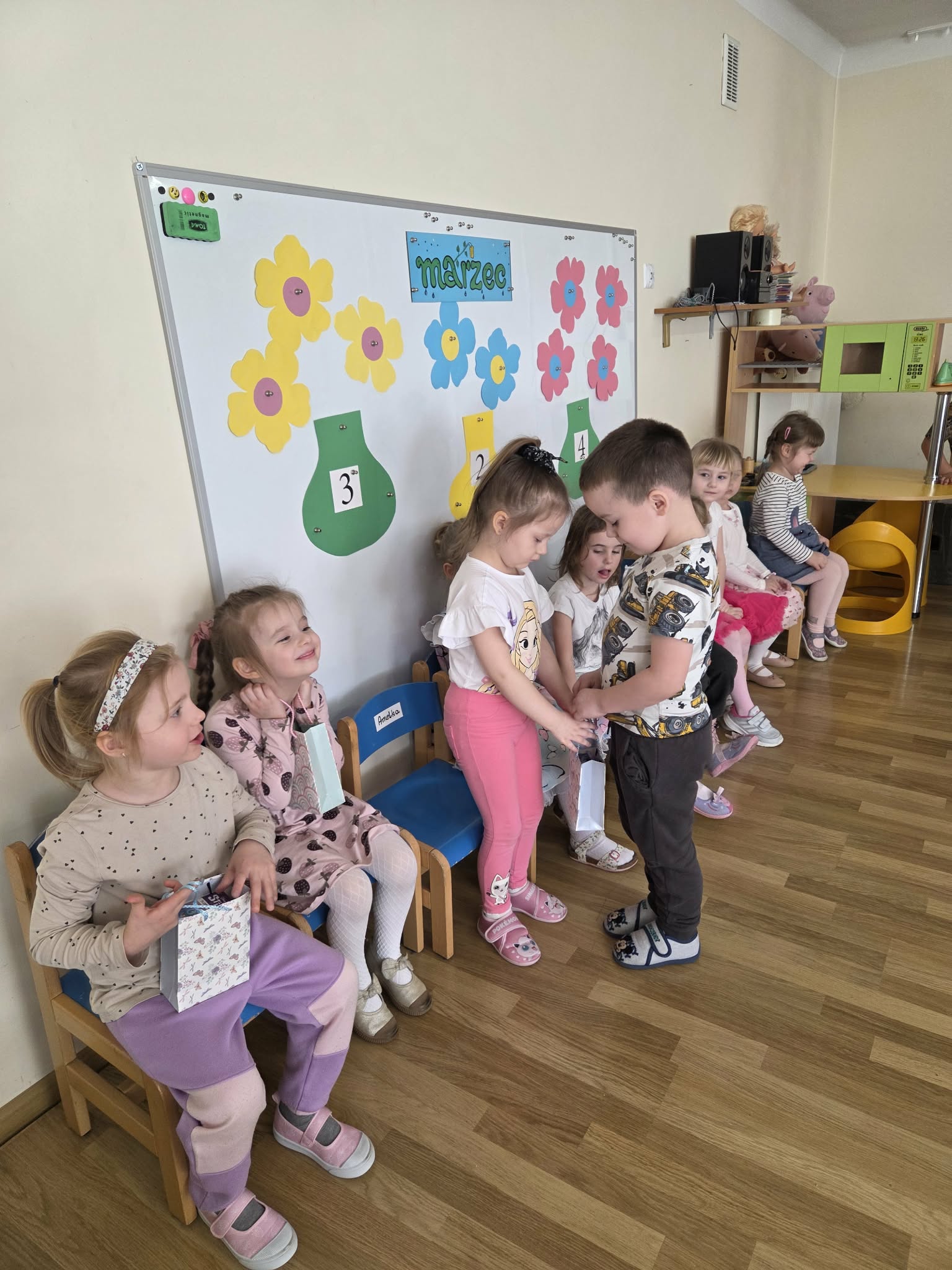 Święto Kobiet, które corocznie obchodzimy w naszym przedszkolu, to doskonały sposób do kształtowania u dzieci nawyku obdarowywania upominkami swoich najbliższych. Wszystkie kobietki, te małe i duże dziękują chłopcom za piękne życzenia.