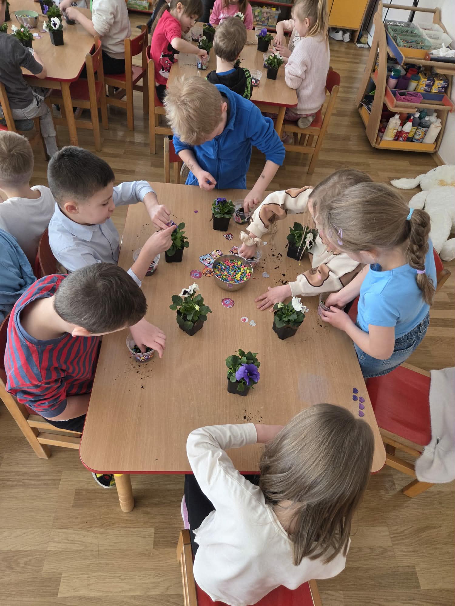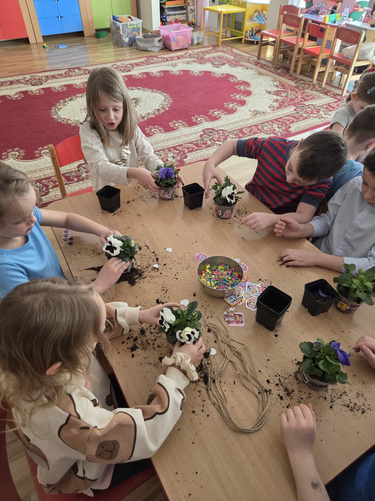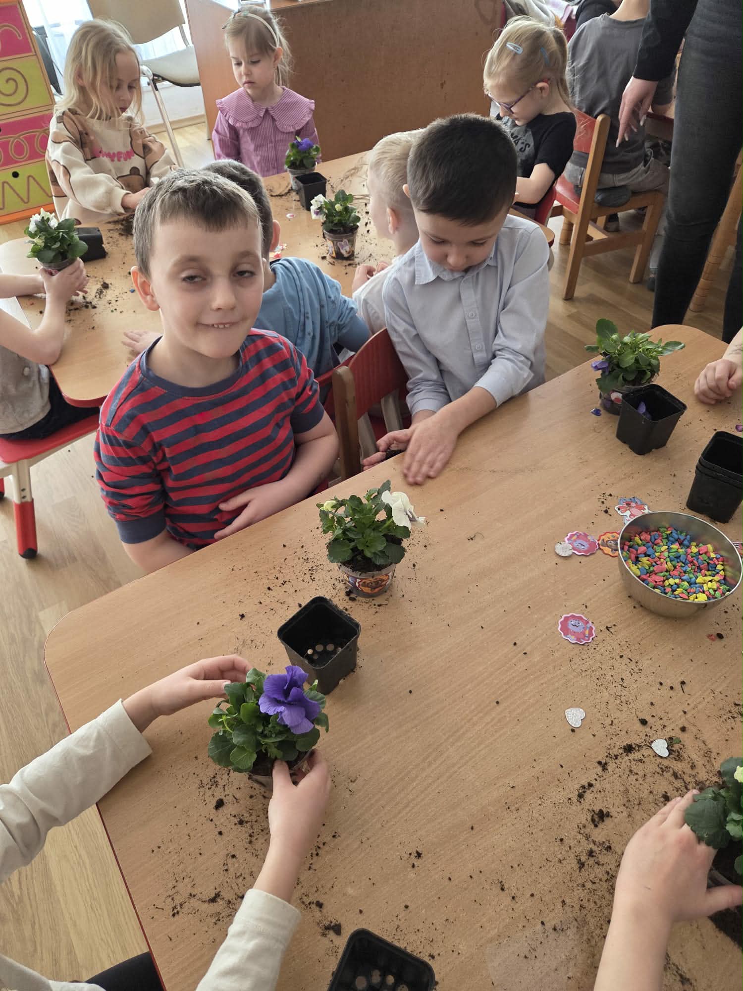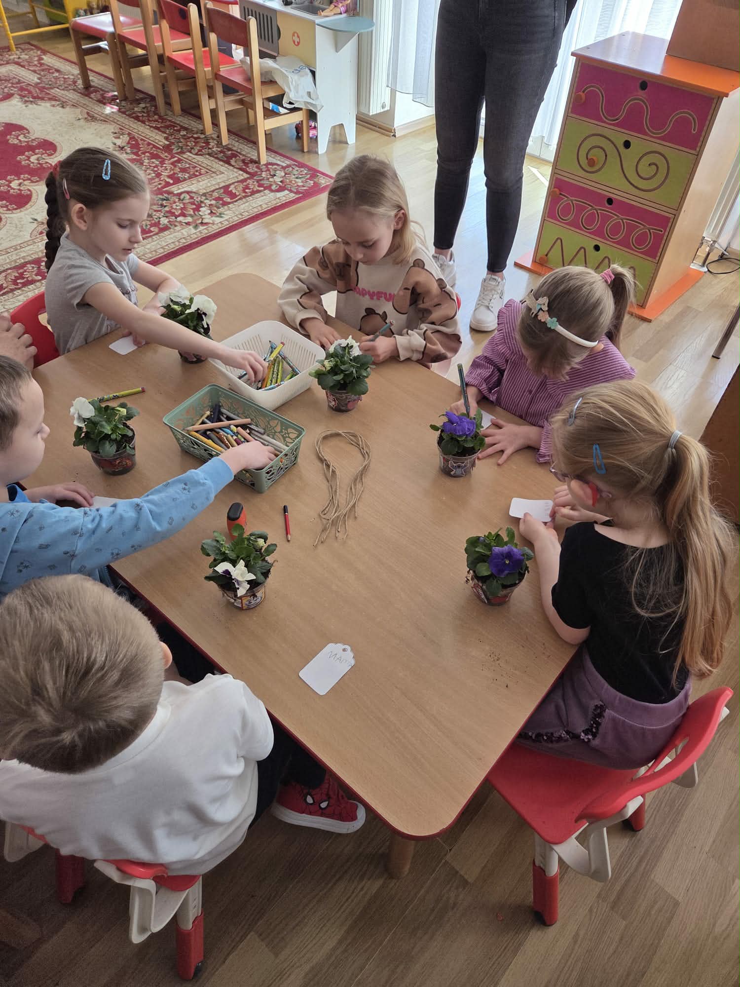 Dzień Kobiet to wyjątkowy dzień, ważny dla wszystkich kobiet zarówno tych dużych, jak i małych. We wszystkich grupach przedszkolnych odbyła się z tej okazji uroczystość. Radosna atmosfera panowała już od samego rana. W tym szczególnym dniu wszystkie kobietki otrzymały serdeczne życzenia i upominki od chłopców. Mali panowie tradycyjnie zaśpiewali swoim koleżankom uroczyste „100 lat” i wręczyli piękne laurki i niespodzianki. Chłopcy ze szczególnym zaangażowaniem starali się, aby ten dzień uczynić wyjątkowo miłym. Jako mali dżentelmeni wyręczali dziewczynki w codziennych obowiązkach między innymi w porządkowaniu sali po zabawie. Było można usłyszeć taneczną muzykę, w rytm której bawiły się zarówno dziewczynki jak i chłopcy. Wiele radości sprawiły dzieciom przygotowane z tej okazji zabawy, a nawet warsztaty sadzenia bratków w starszej grupie Motylków, zorganizowane przez rodziców. Uśmiechnięte buzie przedszkolaków, a zwłaszcza dziewczynek świadczyły o miło spędzonym czasie.