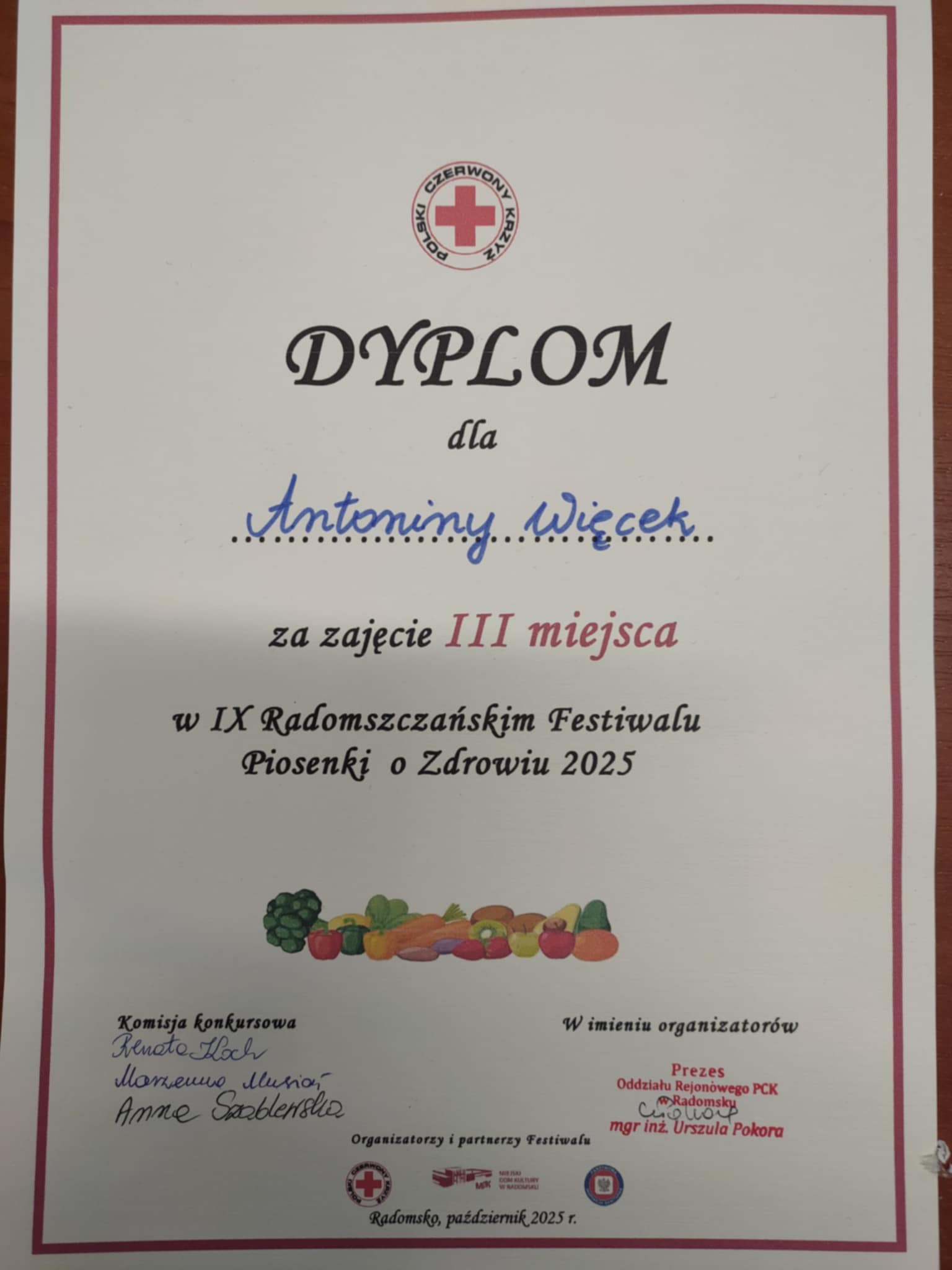 24 pażdziernika w Miejskim Domu Kultury odbył się IX Radomszczański Festiwal Piosenki o Zdrowiu, zorganizowany przez Oddział Rejonowy PCK w Radomsku. W konkursowej kategorii dla przedszkolaków nasze przedszkole reprezentowała Tosia Więcek z grupy Motylków. Śpiewała pięknie piosenkę pt.”Sport to zdrowie” i zdobyła III miejsce. Gratulujemy!