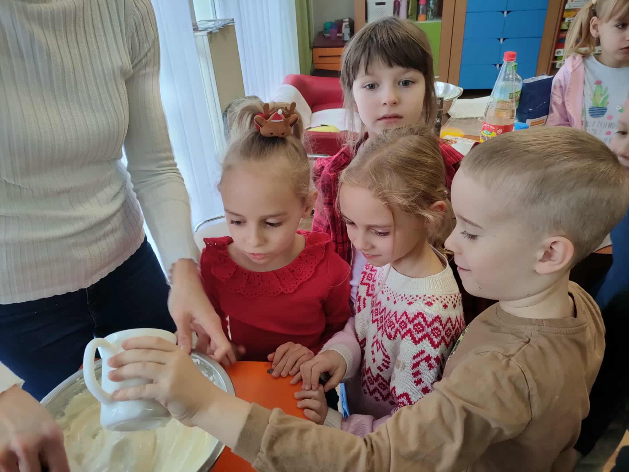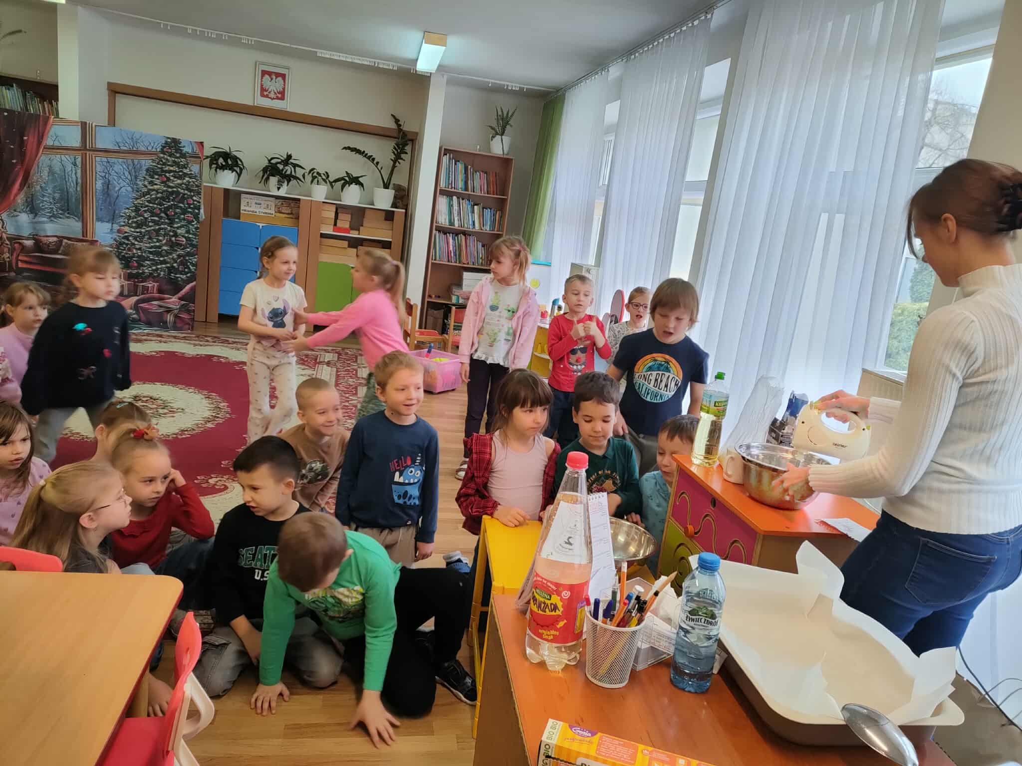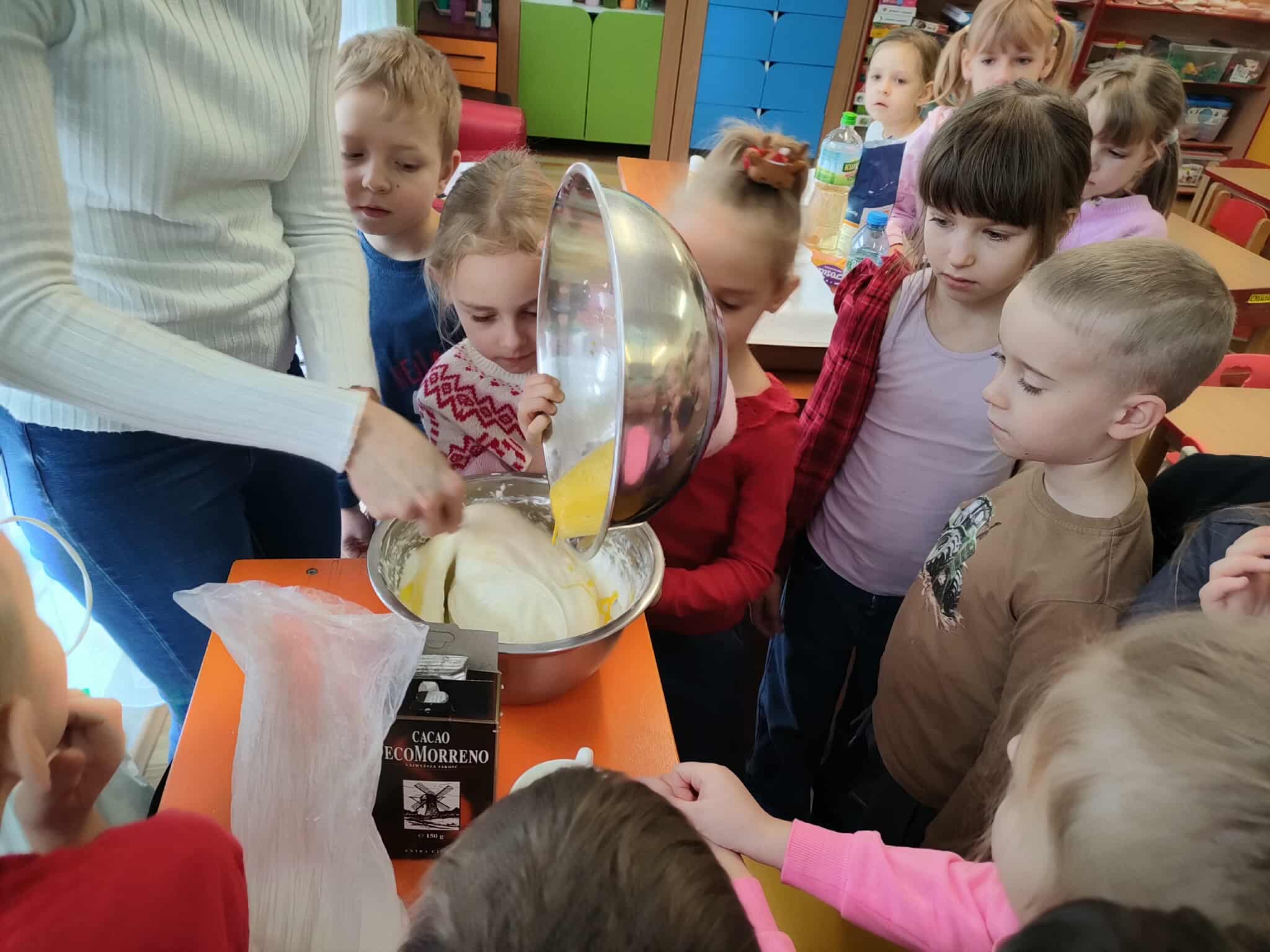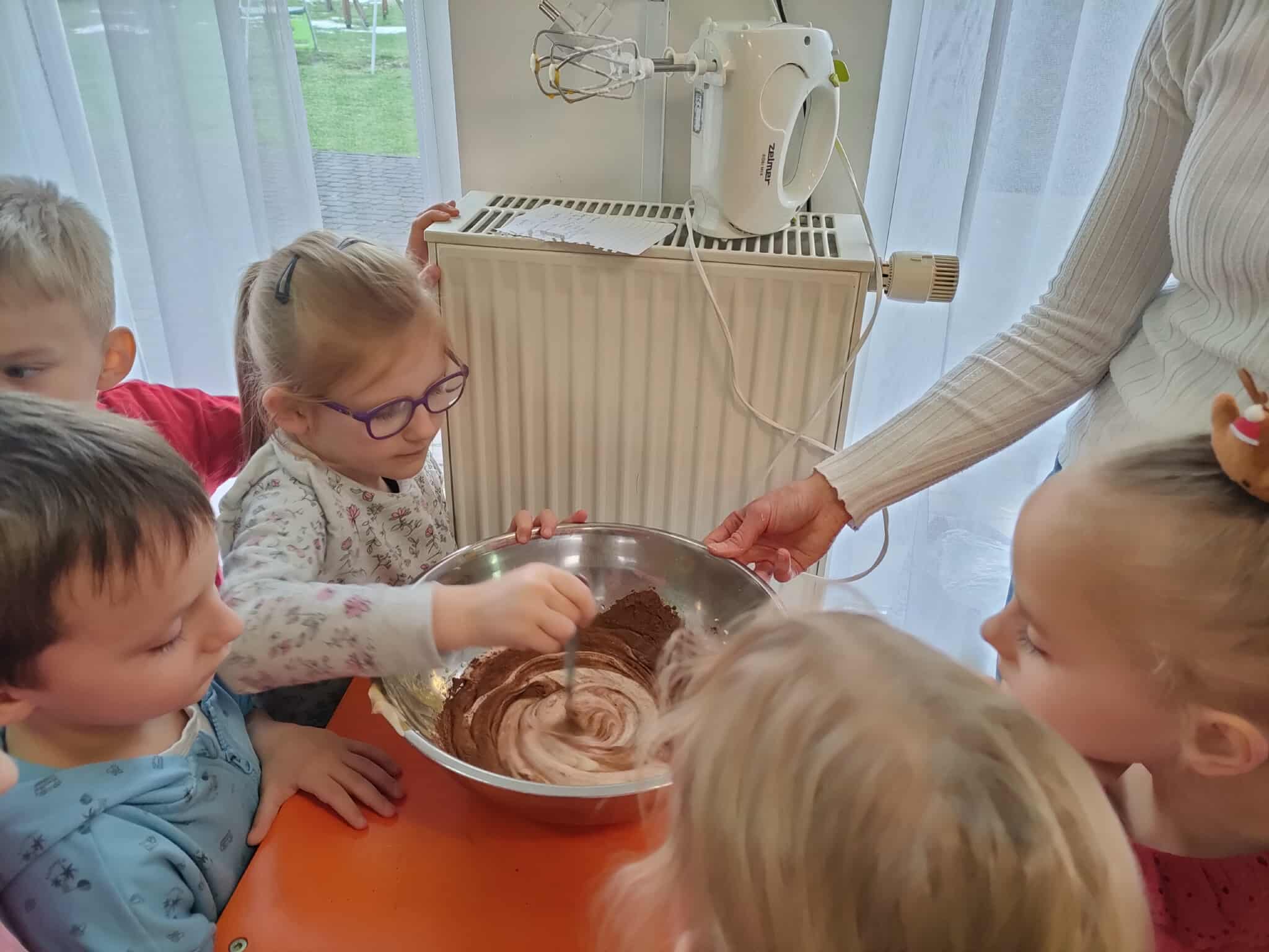 3 grudnia, jeszcze zanim rozpoczęły się warsztaty z rodzicami, Motylki wraz z Panią Sylwią postanowiły upiec ciasto, którym mogłyby poczęstować gości. Ostro wzięły się do pracy i wspólnymi siłami upiekły zebrę. Była przepyszna.