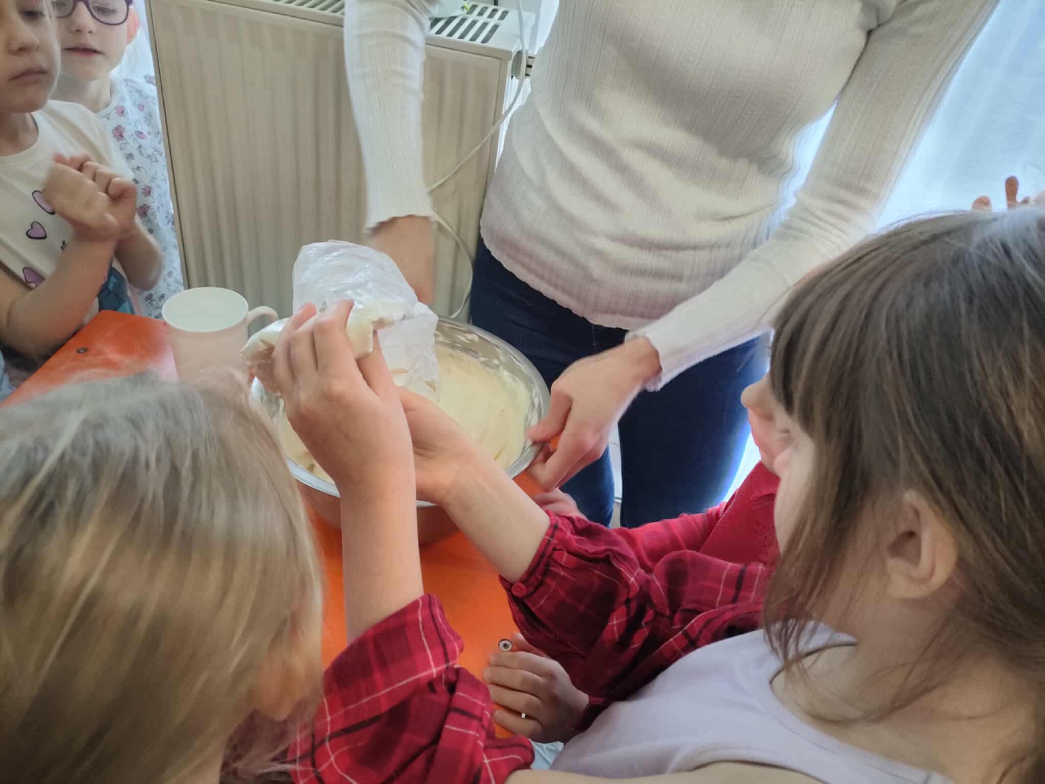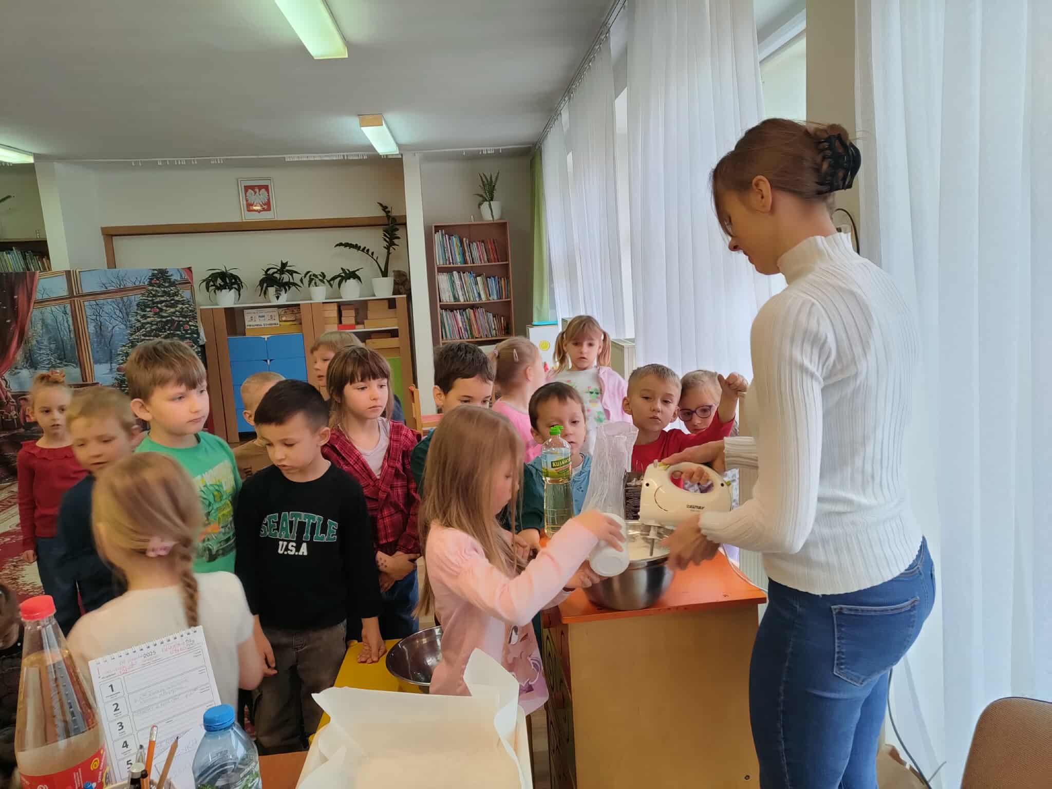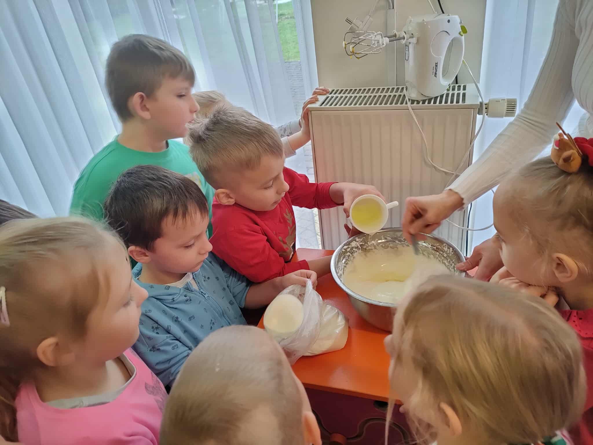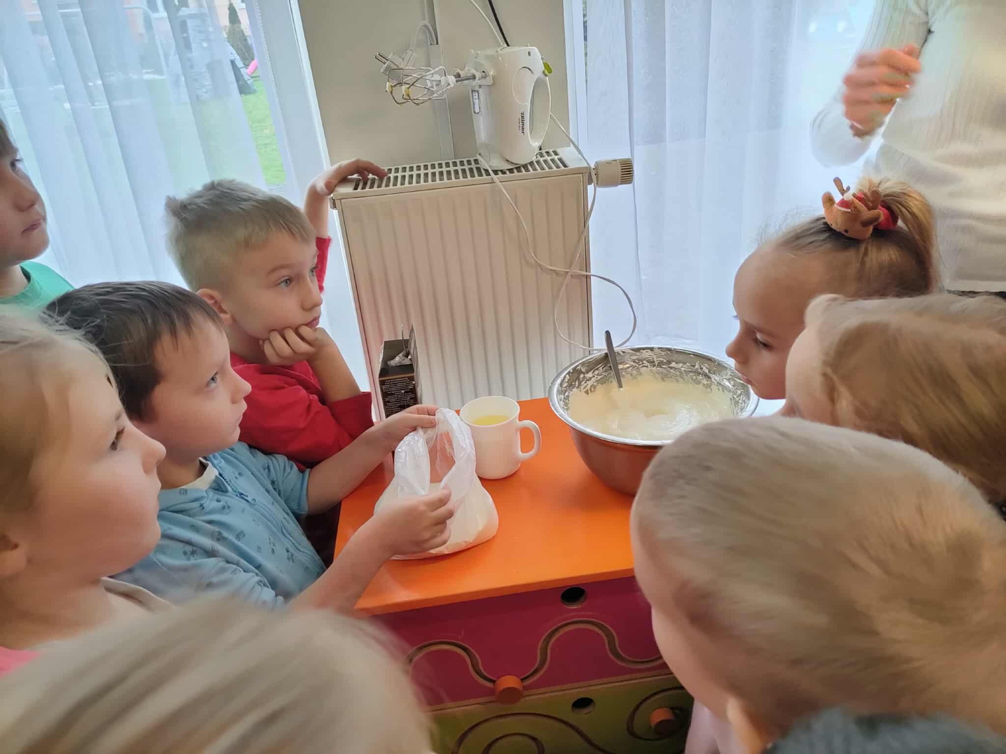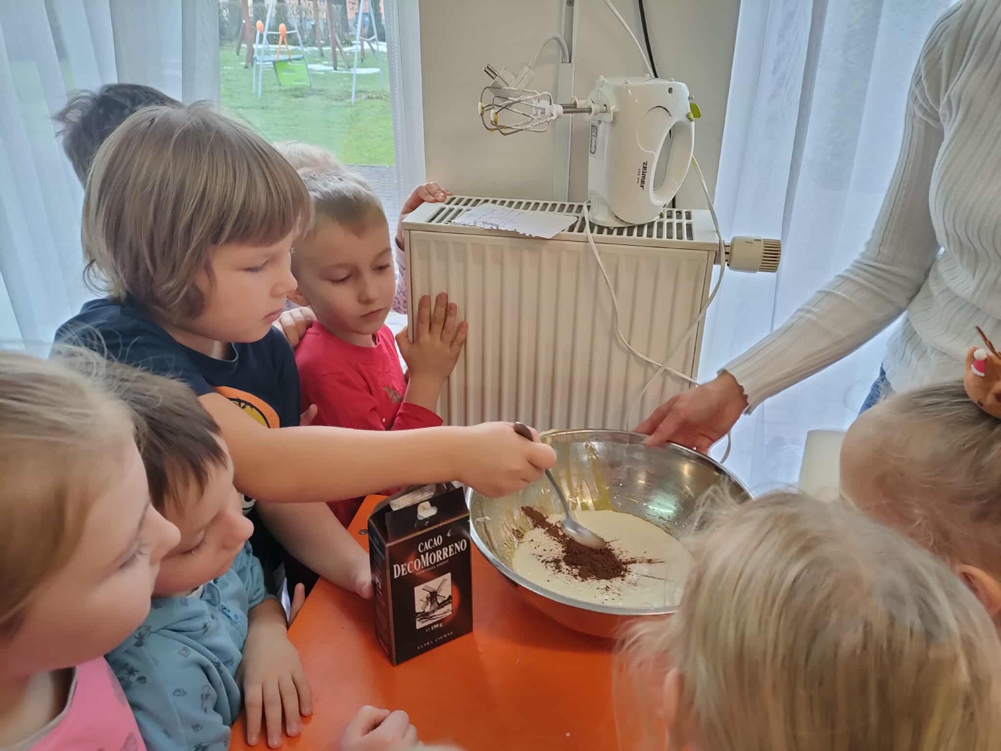 3 grudnia, jeszcze zanim rozpoczęły się warsztaty z rodzicami, Motylki wraz z Panią Sylwią postanowiły upiec ciasto, którym mogłyby poczęstować gości. Ostro wzięły się do pracy i wspólnymi siłami upiekły zebrę. Była przepyszna.