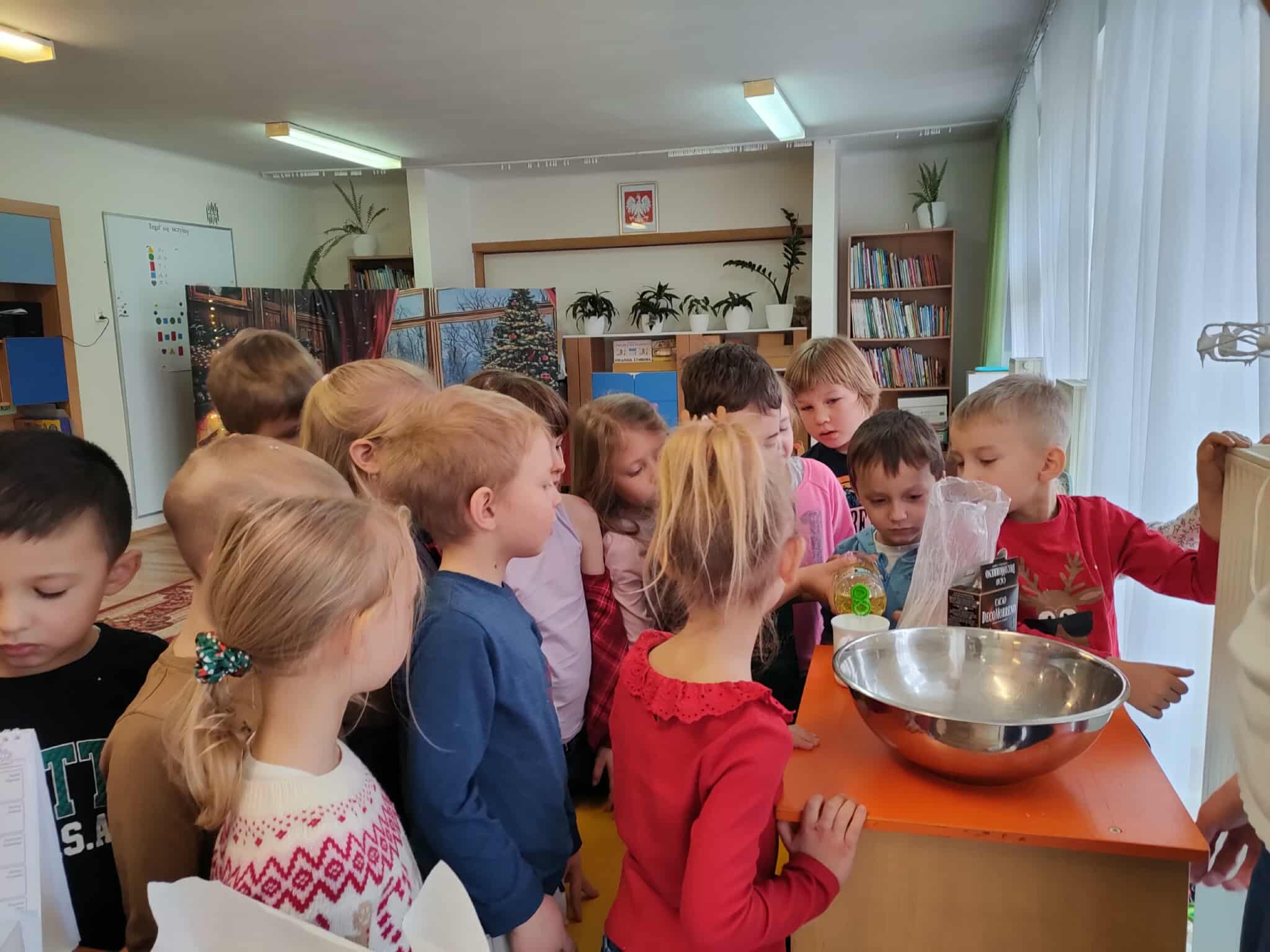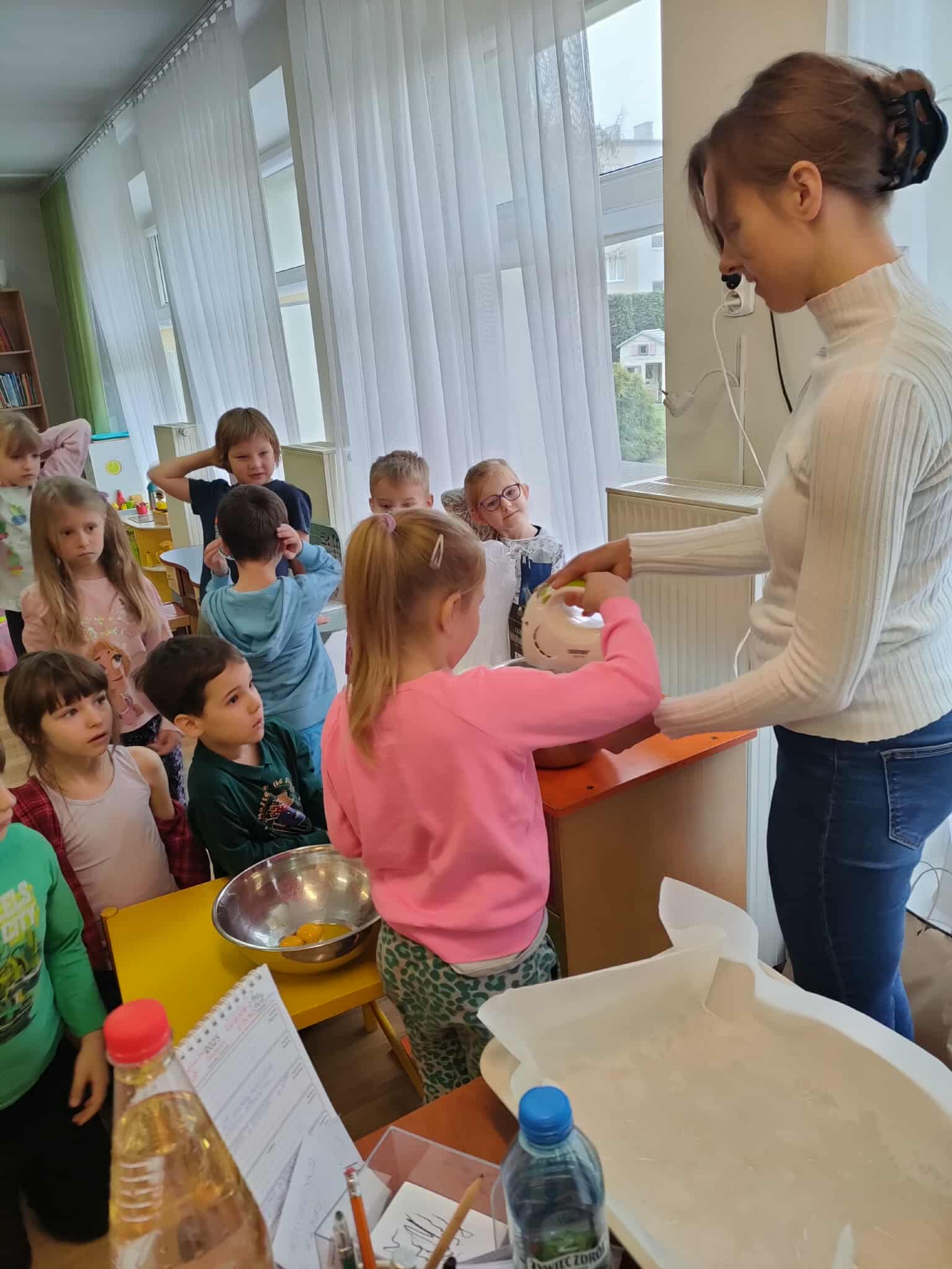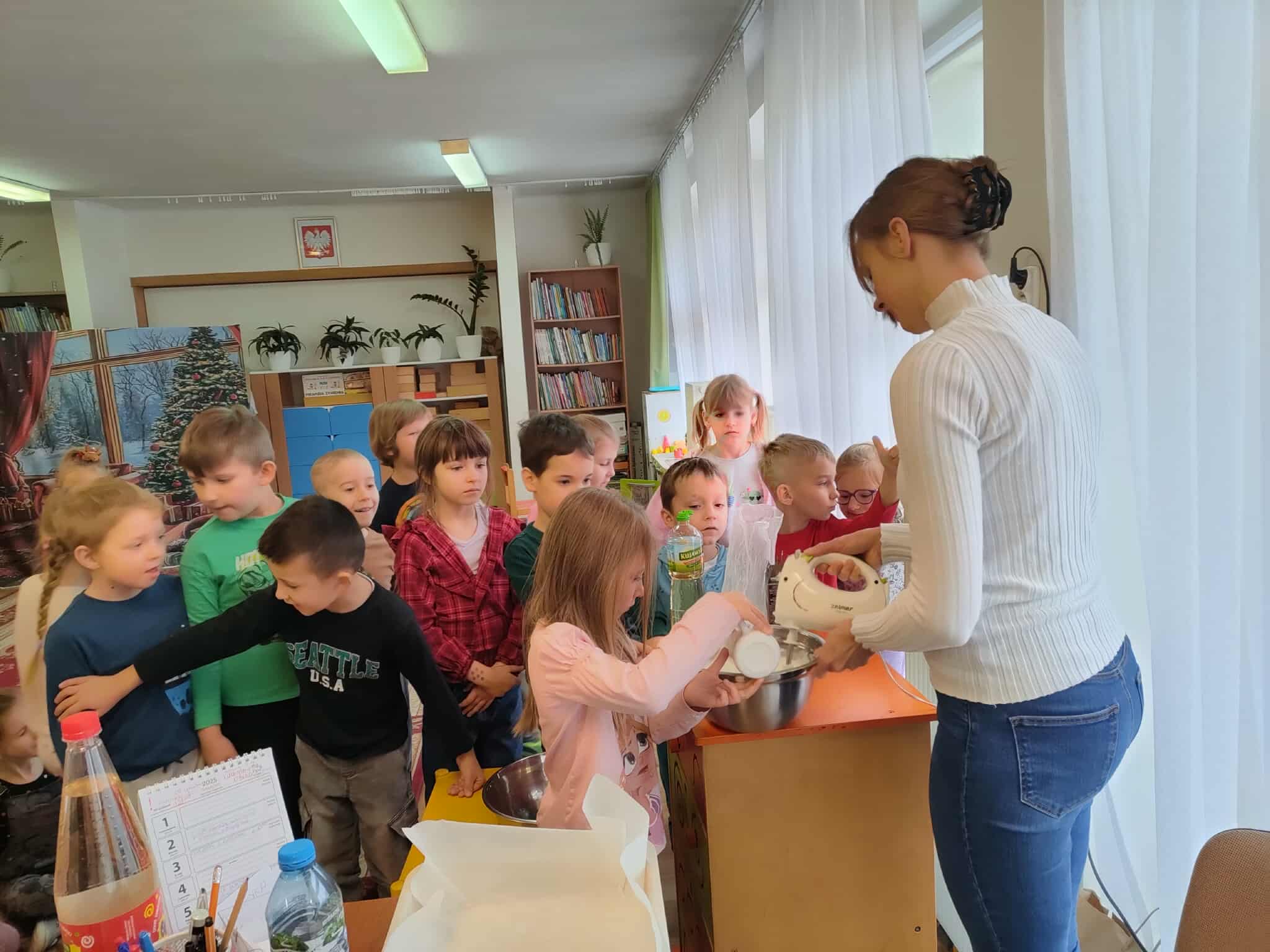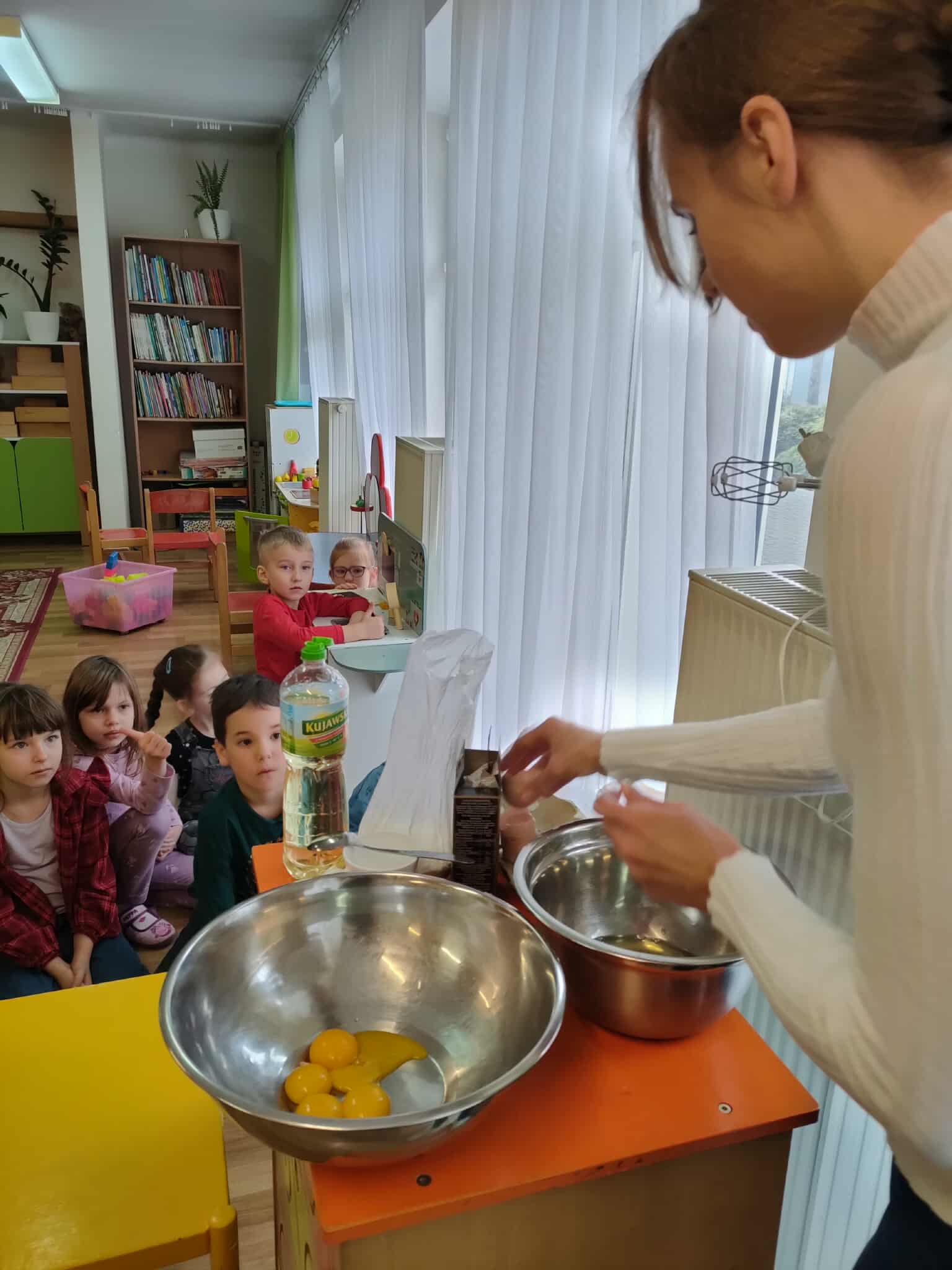 3 grudnia, jeszcze zanim rozpoczęły się warsztaty z rodzicami, Motylki wraz z Panią Sylwią postanowiły upiec ciasto, którym mogłyby poczęstować gości. Ostro wzięły się do pracy i wspólnymi siłami upiekły zebrę. Była przepyszna.