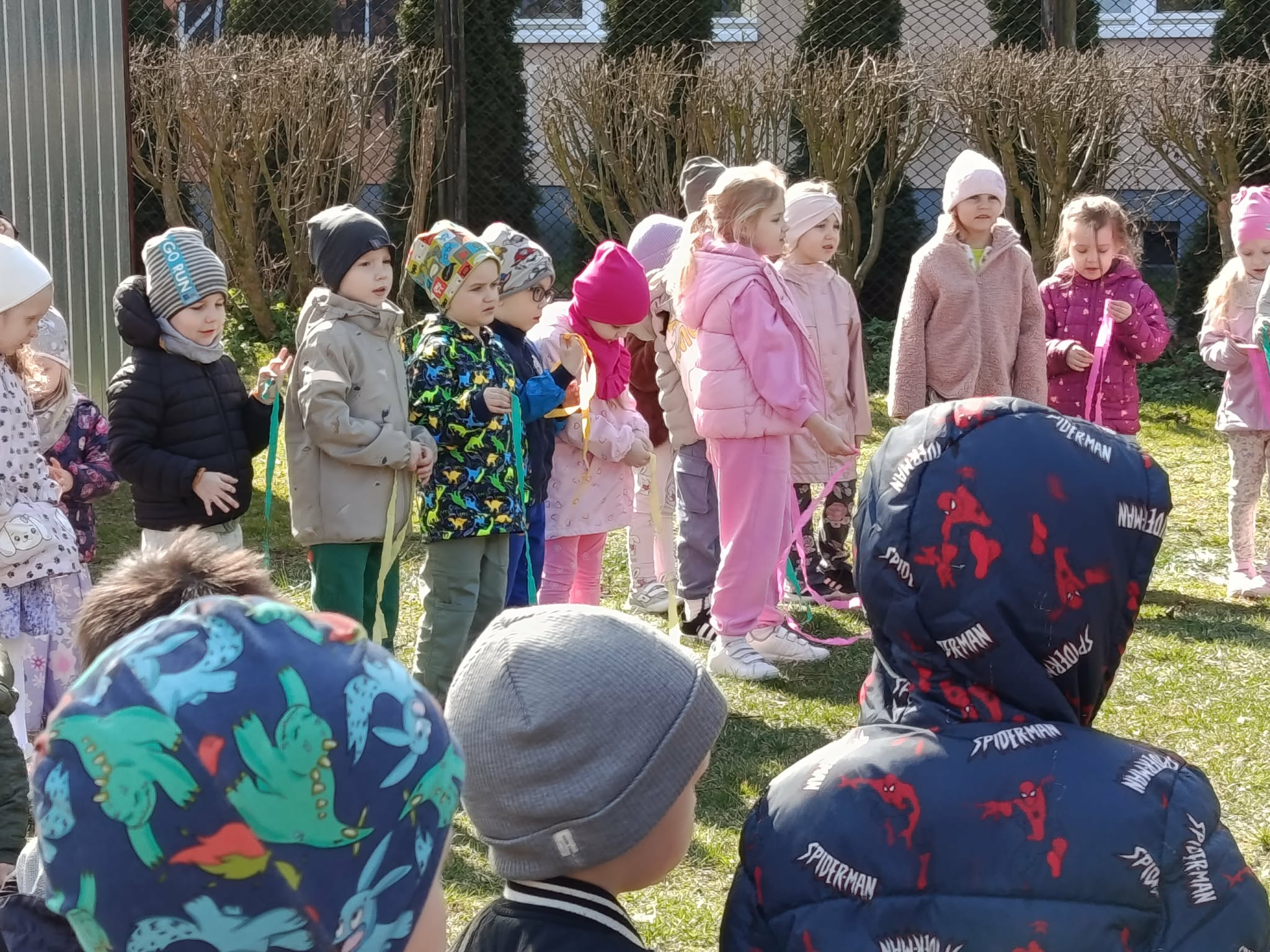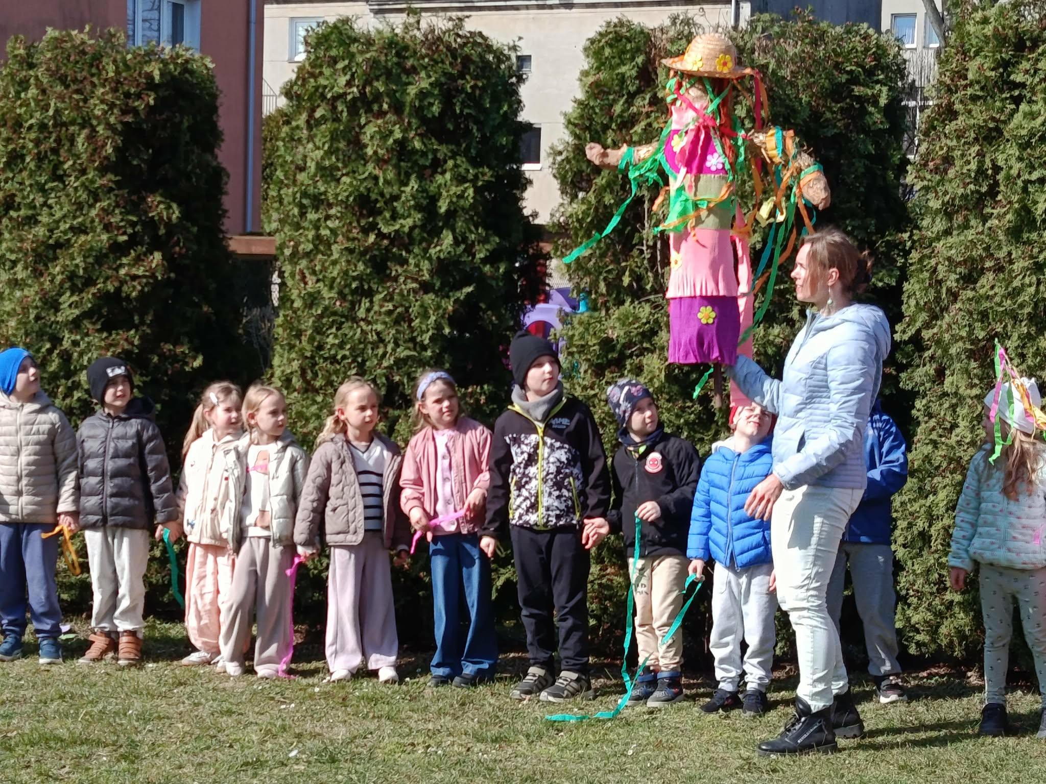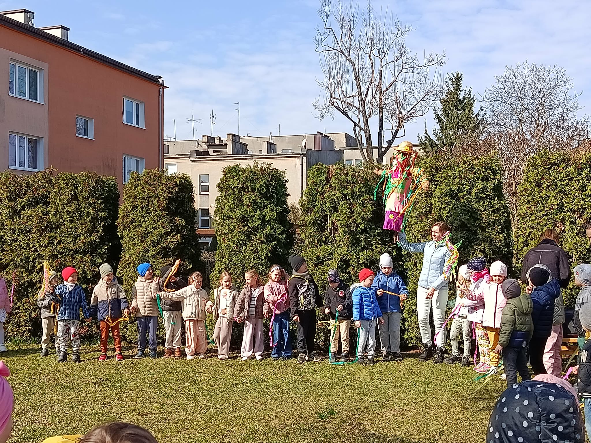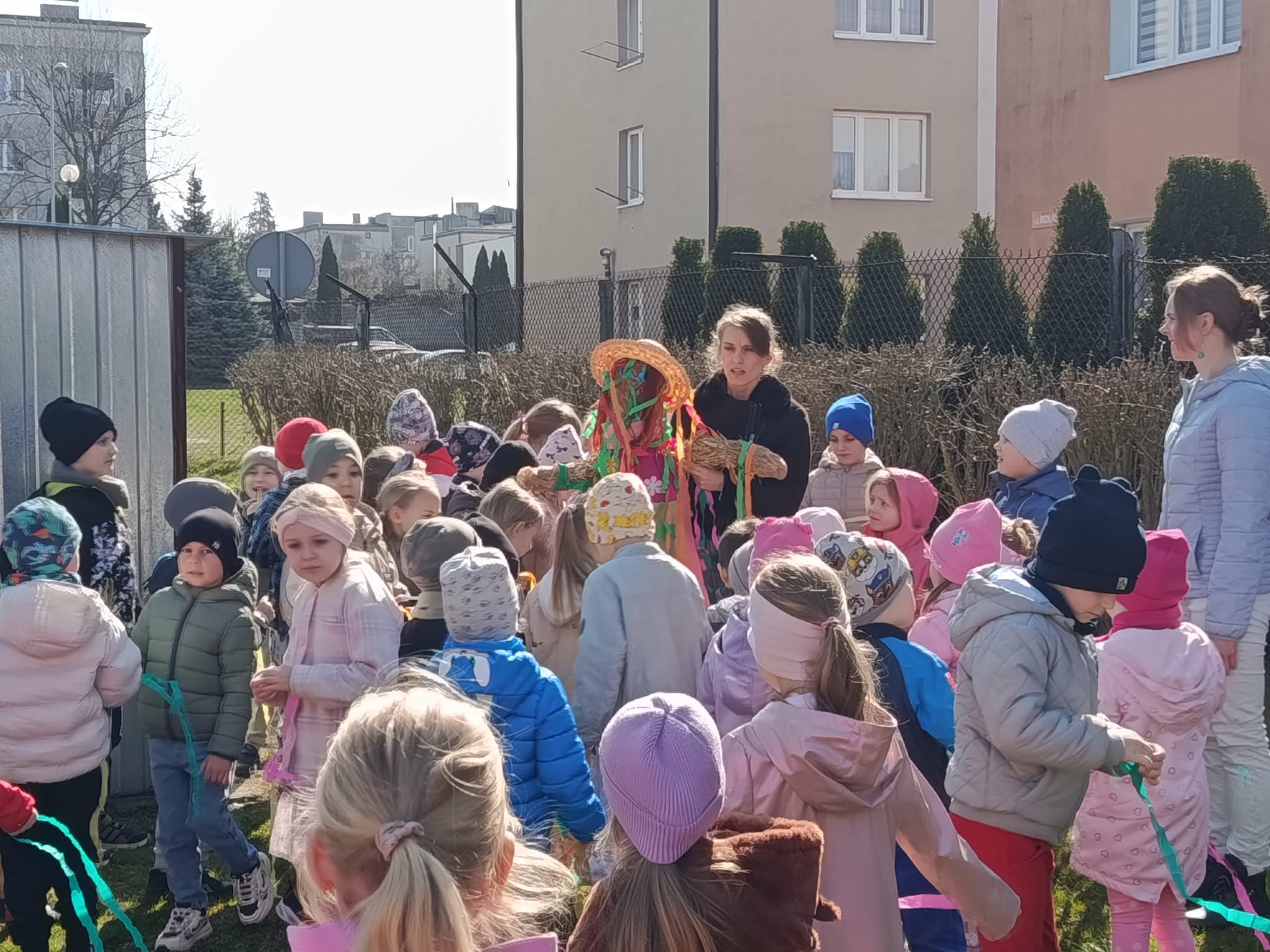 W poniedziałek 23 marca wszystkie przedszkolaki wzięły udział w tradycyjnym obrzędzie „Pożegnania zimy – powitania wiosny”. Przedszkolaki kultywując starodawne zwyczaje radośnie maszerowały po całym ogrodzie przedszkolnym w wiosennym pochodzie z Marzanną. Szukały oznak nowej pory roku i śpiewały piosenki o wiośnie. „Zebraliśmy się, by wszystkim dzieciom i dorosłym podać najświeższe wiadomości. Od dziś wiosna u nas zagości. W związku z tym zapraszamy na spotkanie i może ktoś odpowie na krótkie pytania”. Dzieci chętnie odpowiedziały na wszystkie pytania, wraz z grupą Motylków śpiewały piosenki o pomocnikach nowej pory roku. Aby tradycji stało się zadość, Marzanna została uroczyście pożegnana głośnym okrzykiem: ”Marzanno, Marzanno, odejdź już prosimy, nie chcemy już więcej żadnych śladów zimy. Niech odejdą z Tobą mrozy oraz chłody, o powrocie zimy nie może być mowy!”. Powitanie wiosny w przedszkolu było pełne radości i kreatywności! Dzieci miały okazję przywitać wyjątkowego gościa – Panią Wiosnę, która zainspirowała je do wspólnych zabaw na placu przedszkolnym. Wiosna przyszła do nas tego roku pod postacią Biedronki, która siadała na kurtkach dzieci witając się w ten sposób z nimi. Były to nie tylko okazją do świętowania nadejścia wiosny, ale również piękną lekcją przyrody, pełną barw i zapachów. To wydarzenie pozostawiło w sercach najmłodszych wiele uśmiechów.