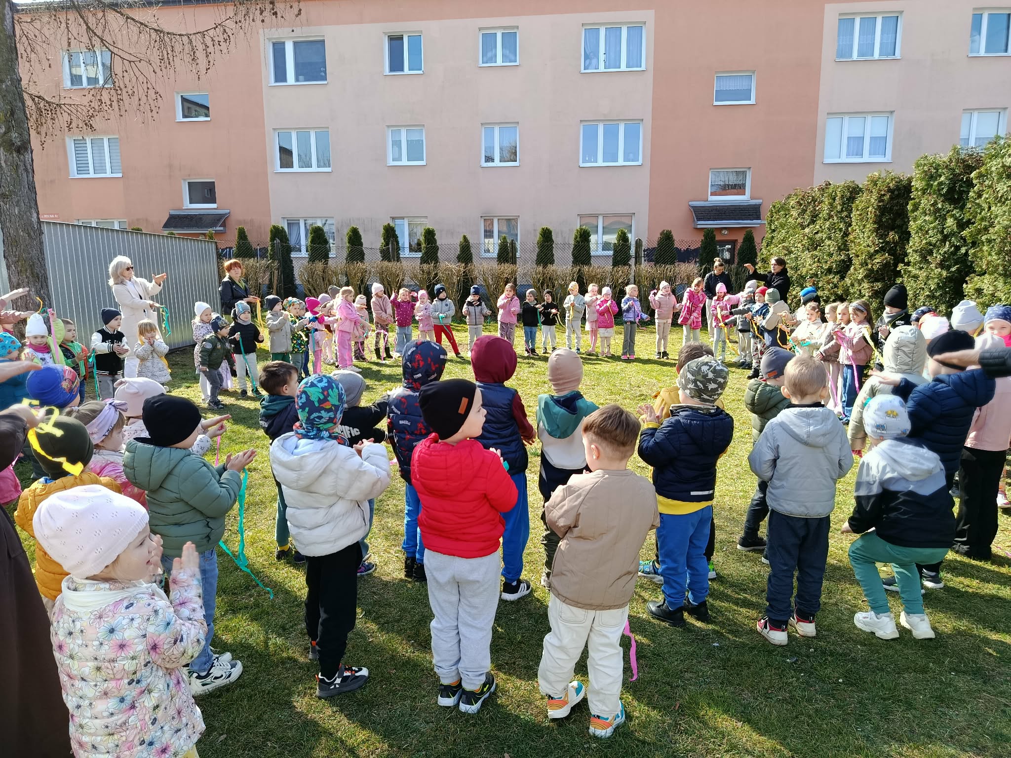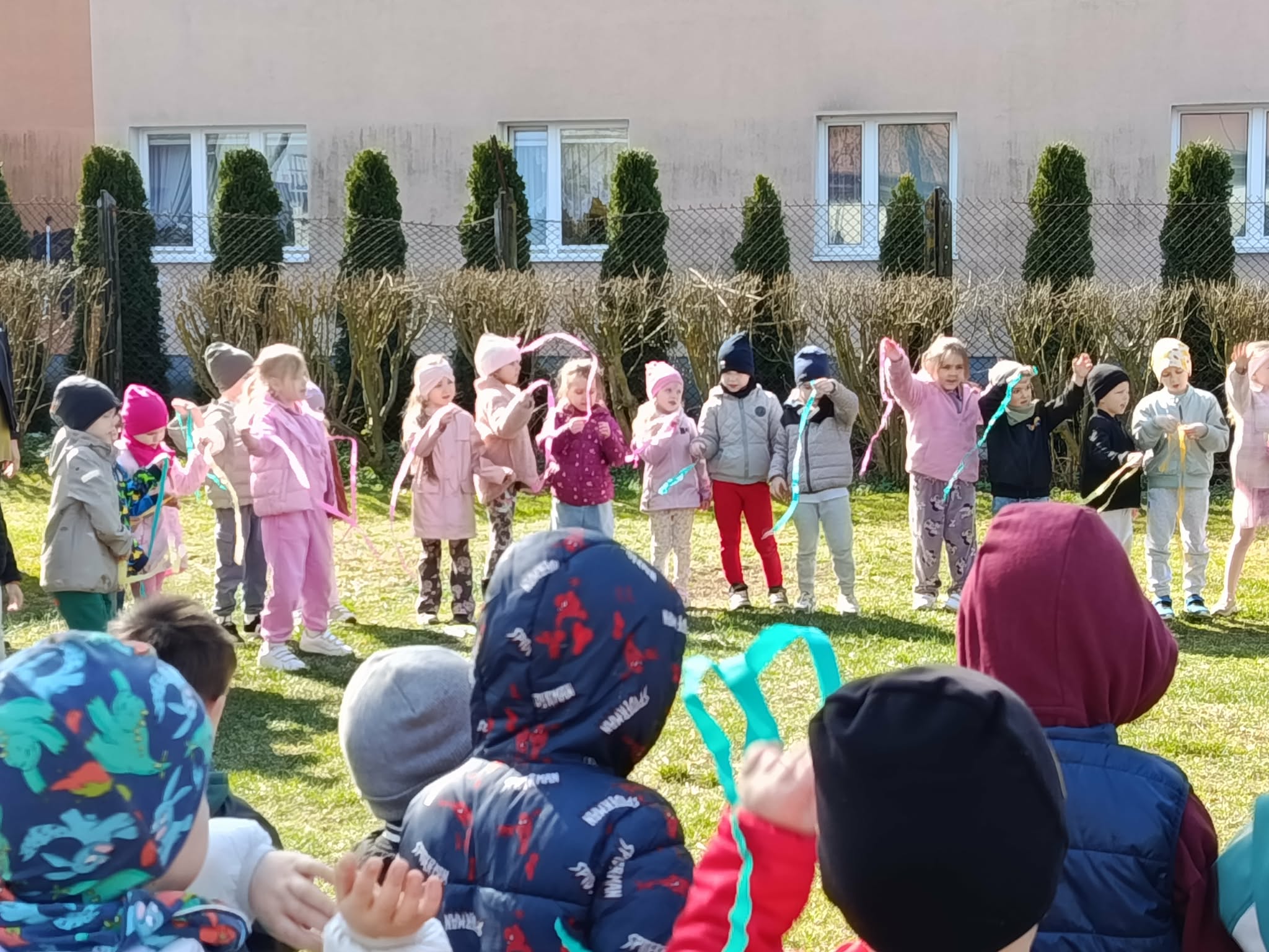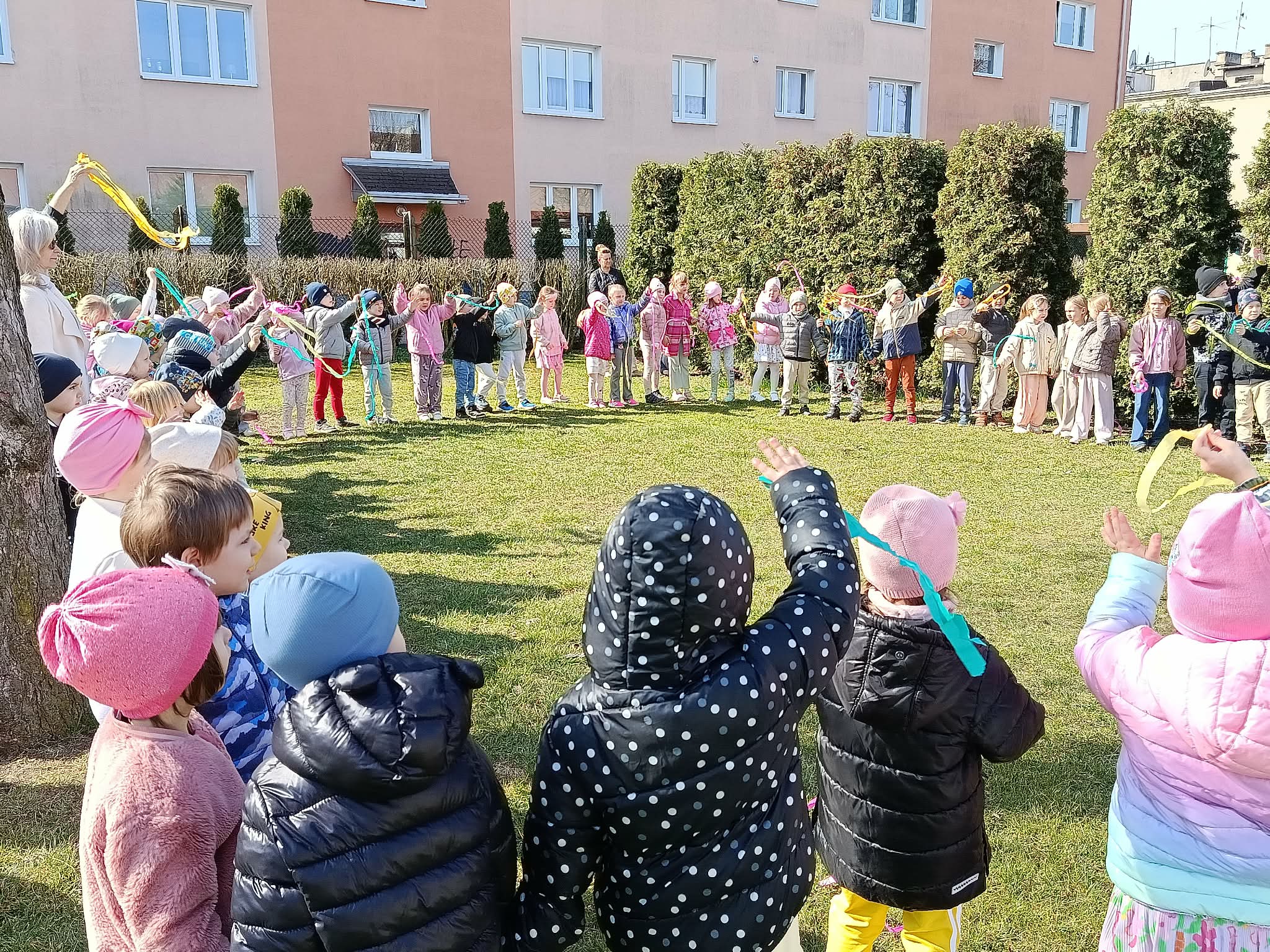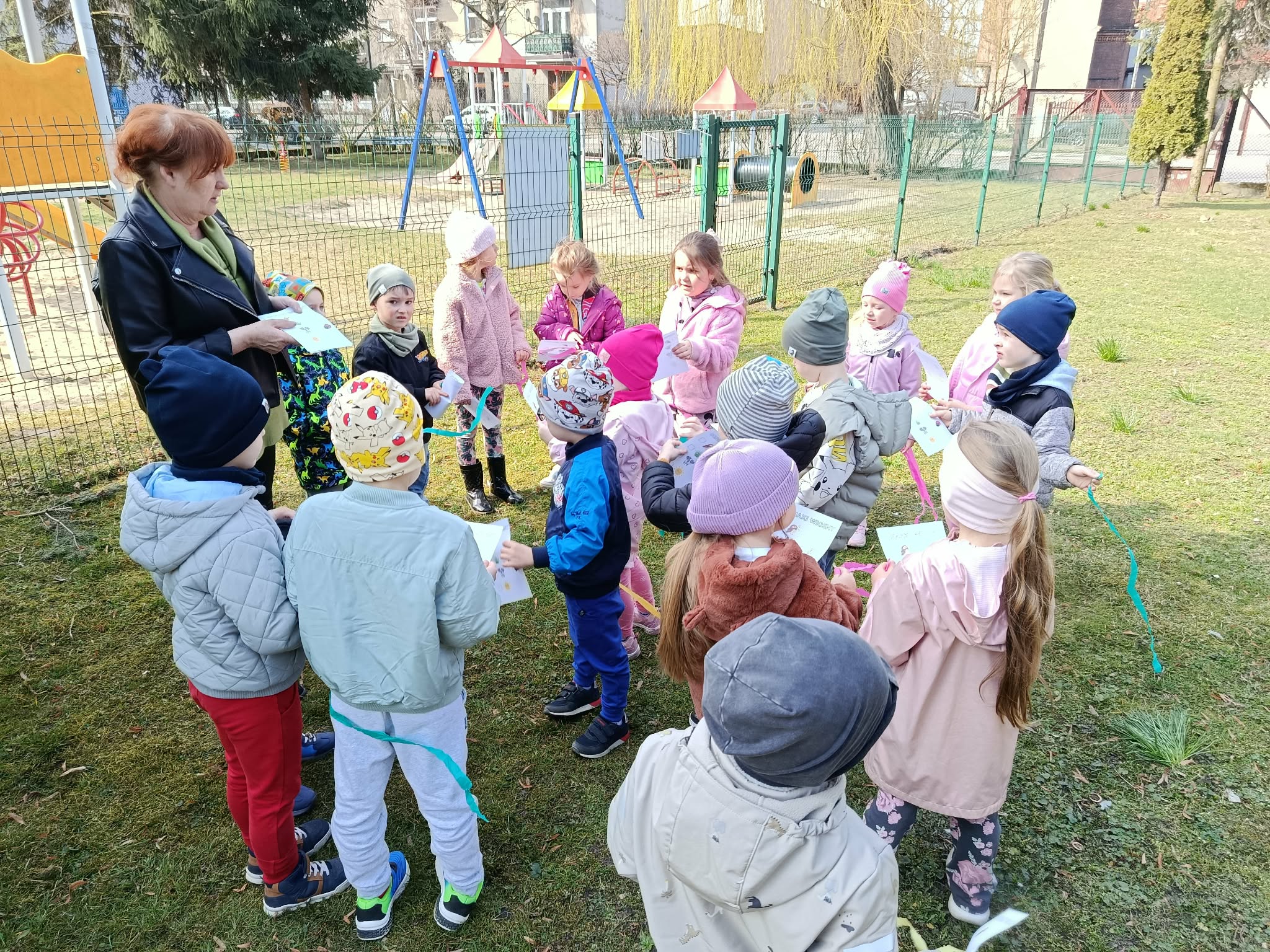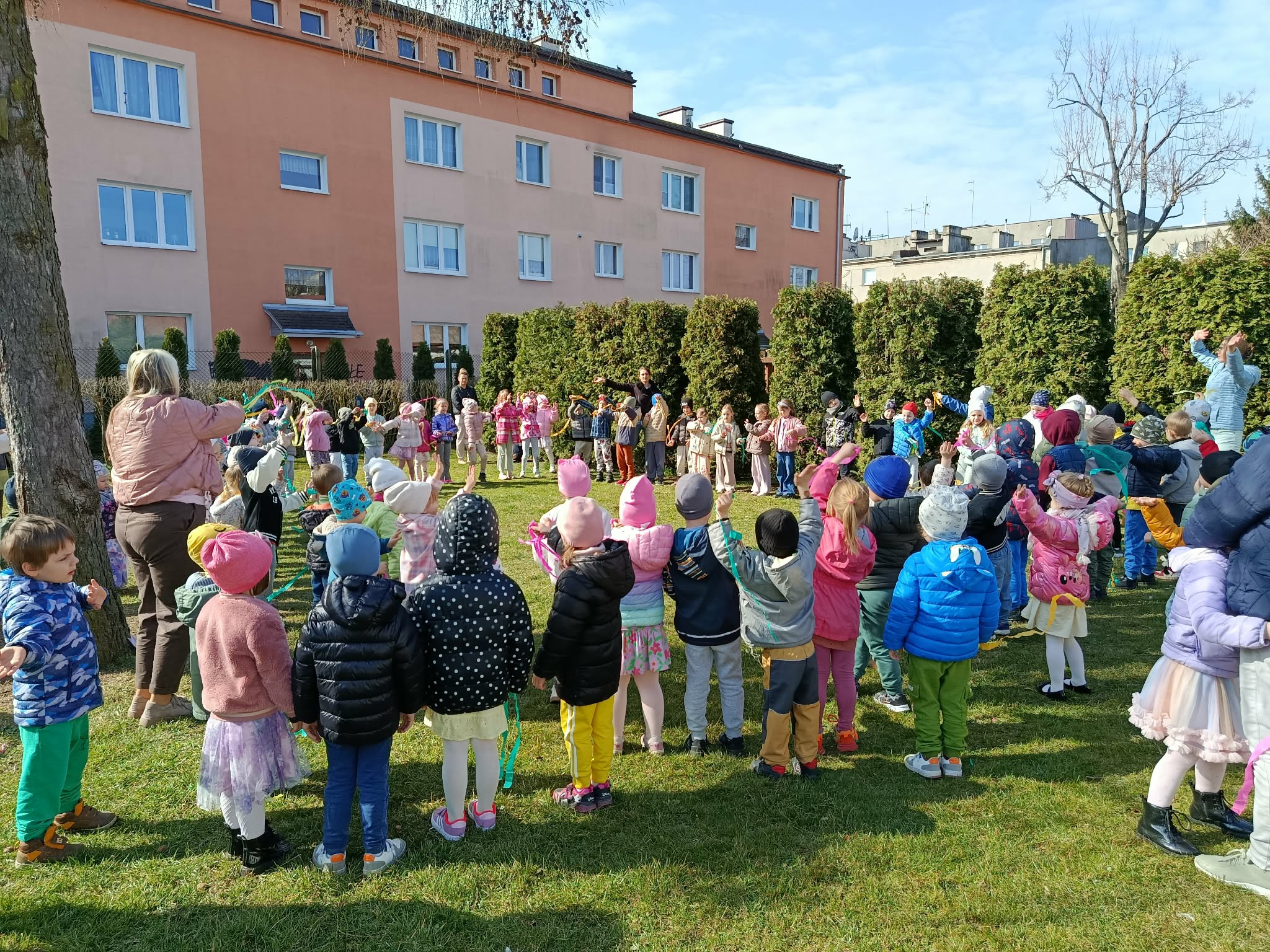 W poniedziałek 23 marca wszystkie przedszkolaki wzięły udział w tradycyjnym obrzędzie „Pożegnania zimy – powitania wiosny”. Przedszkolaki kultywując starodawne zwyczaje radośnie maszerowały po całym ogrodzie przedszkolnym w wiosennym pochodzie z Marzanną. Szukały oznak nowej pory roku i śpiewały piosenki o wiośnie. „Zebraliśmy się, by wszystkim dzieciom i dorosłym podać najświeższe wiadomości. Od dziś wiosna u nas zagości. W związku z tym zapraszamy na spotkanie i może ktoś odpowie na krótkie pytania”. Dzieci chętnie odpowiedziały na wszystkie pytania, wraz z grupą Motylków śpiewały piosenki o pomocnikach nowej pory roku. Aby tradycji stało się zadość, Marzanna została uroczyście pożegnana głośnym okrzykiem: ”Marzanno, Marzanno, odejdź już prosimy, nie chcemy już więcej żadnych śladów zimy. Niech odejdą z Tobą mrozy oraz chłody, o powrocie zimy nie może być mowy!”. Powitanie wiosny w przedszkolu było pełne radości i kreatywności! Dzieci miały okazję przywitać wyjątkowego gościa – Panią Wiosnę, która zainspirowała je do wspólnych zabaw na placu przedszkolnym. Wiosna przyszła do nas tego roku pod postacią Biedronki, która siadała na kurtkach dzieci witając się w ten sposób z nimi. Były to nie tylko okazją do świętowania nadejścia wiosny, ale również piękną lekcją przyrody, pełną barw i zapachów. To wydarzenie pozostawiło w sercach najmłodszych wiele uśmiechów.