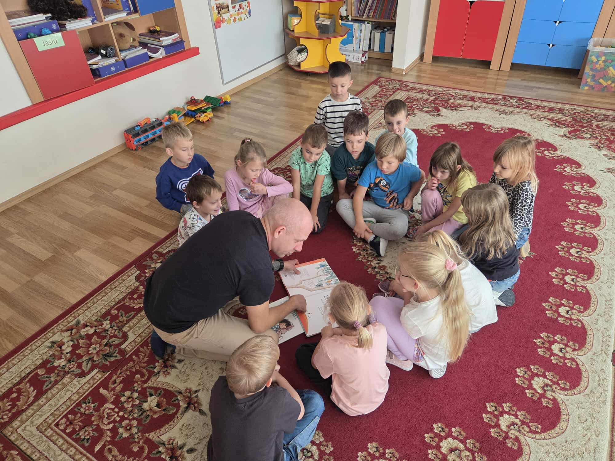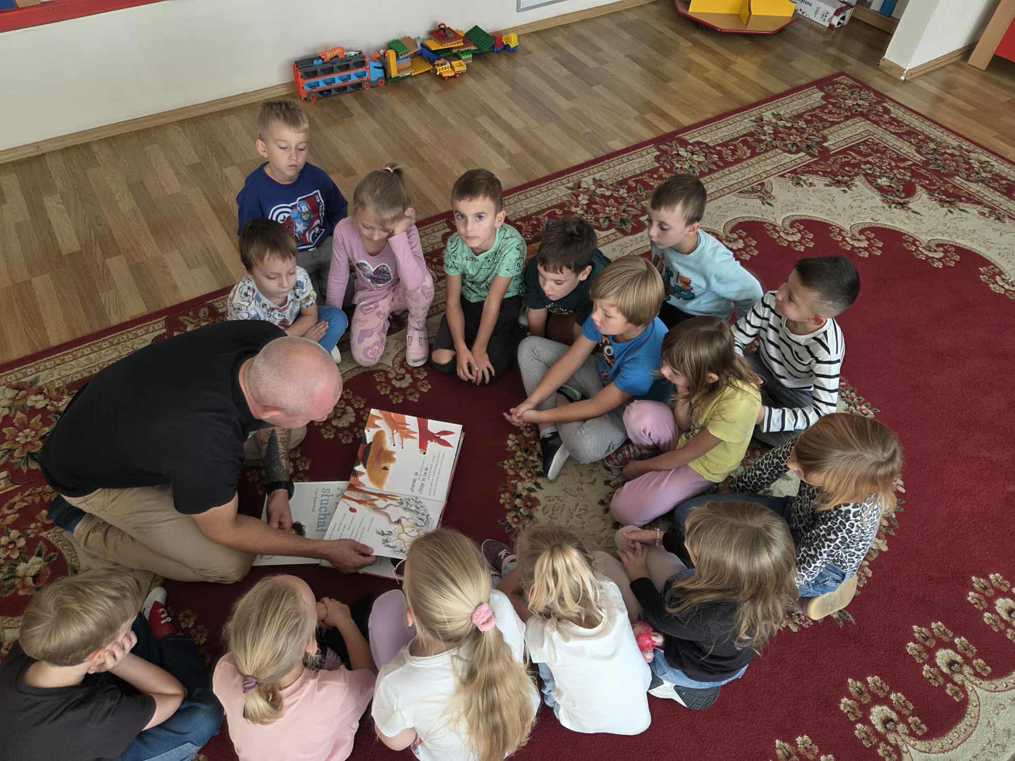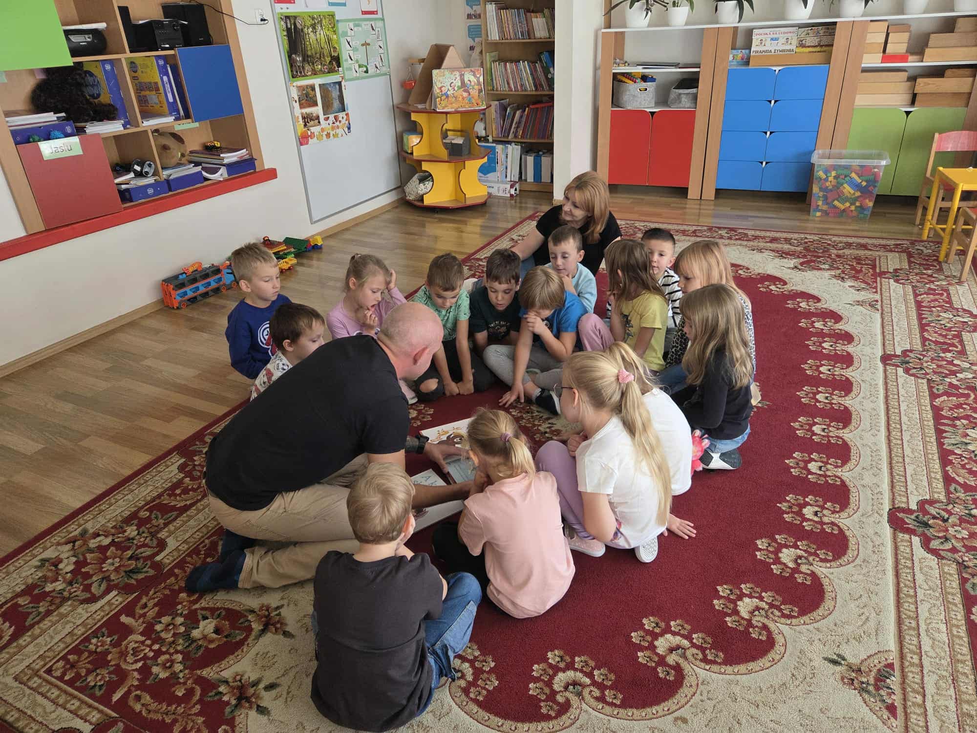 Rodzice czytają dzieciom w przedszkolu.