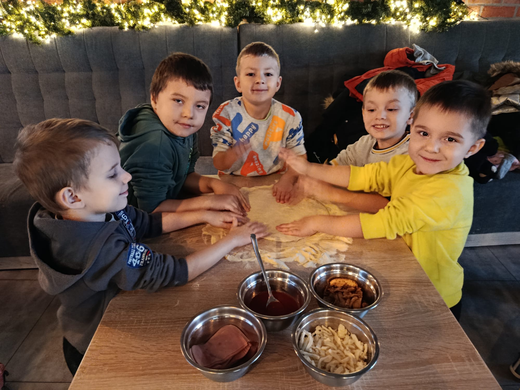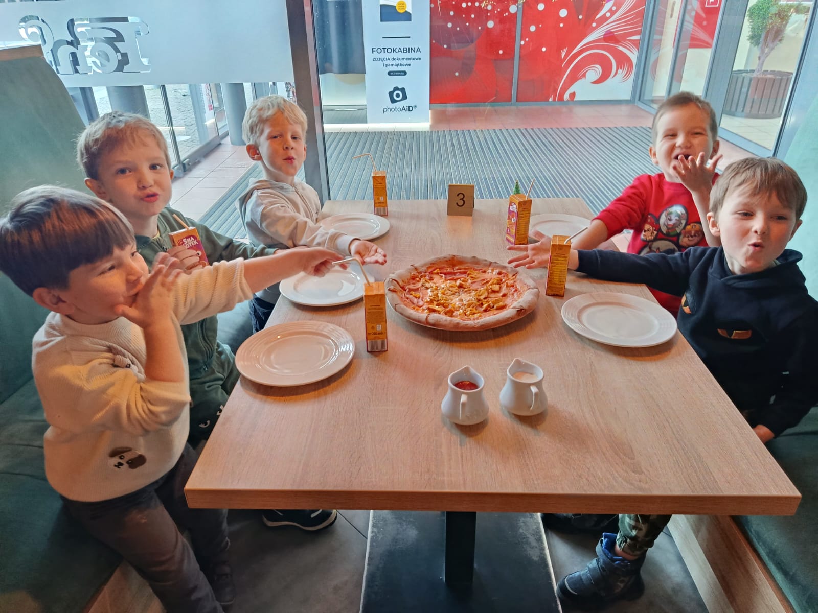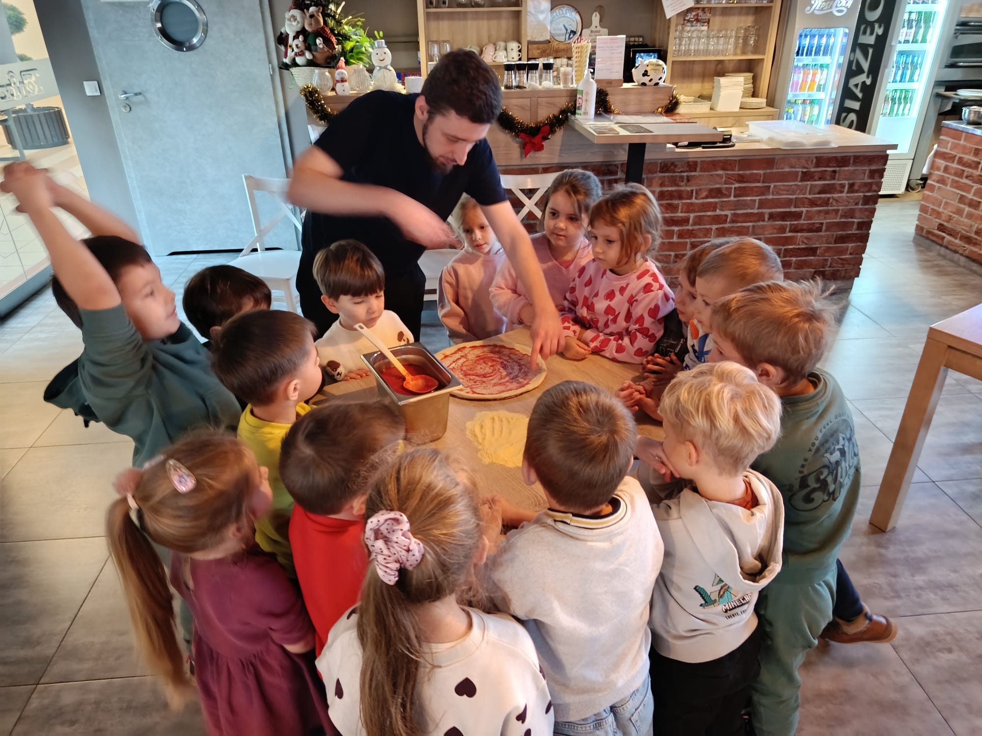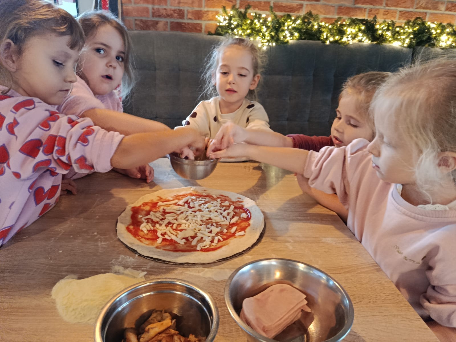Przedszkolaki z grupy Słoneczka uczestniczyły w warsztatach kulinarnych w pizzerii Fenix. Najpierw przedszkolaki poznały historię pizzy. Obserwowały proces jej powstawania podczas pokazu przeprowadzonego przez pizzermana. Następnie przedszkolaki samodzielnie wykonały pizzę z ulubionymi dodatkami. Po upieczeniu była prawdziwa uczta, pizza smakowała wybornie! Dzieci były bardzo zaciekawione i zachwycone efektem końcowym. To były super doświadczenia.