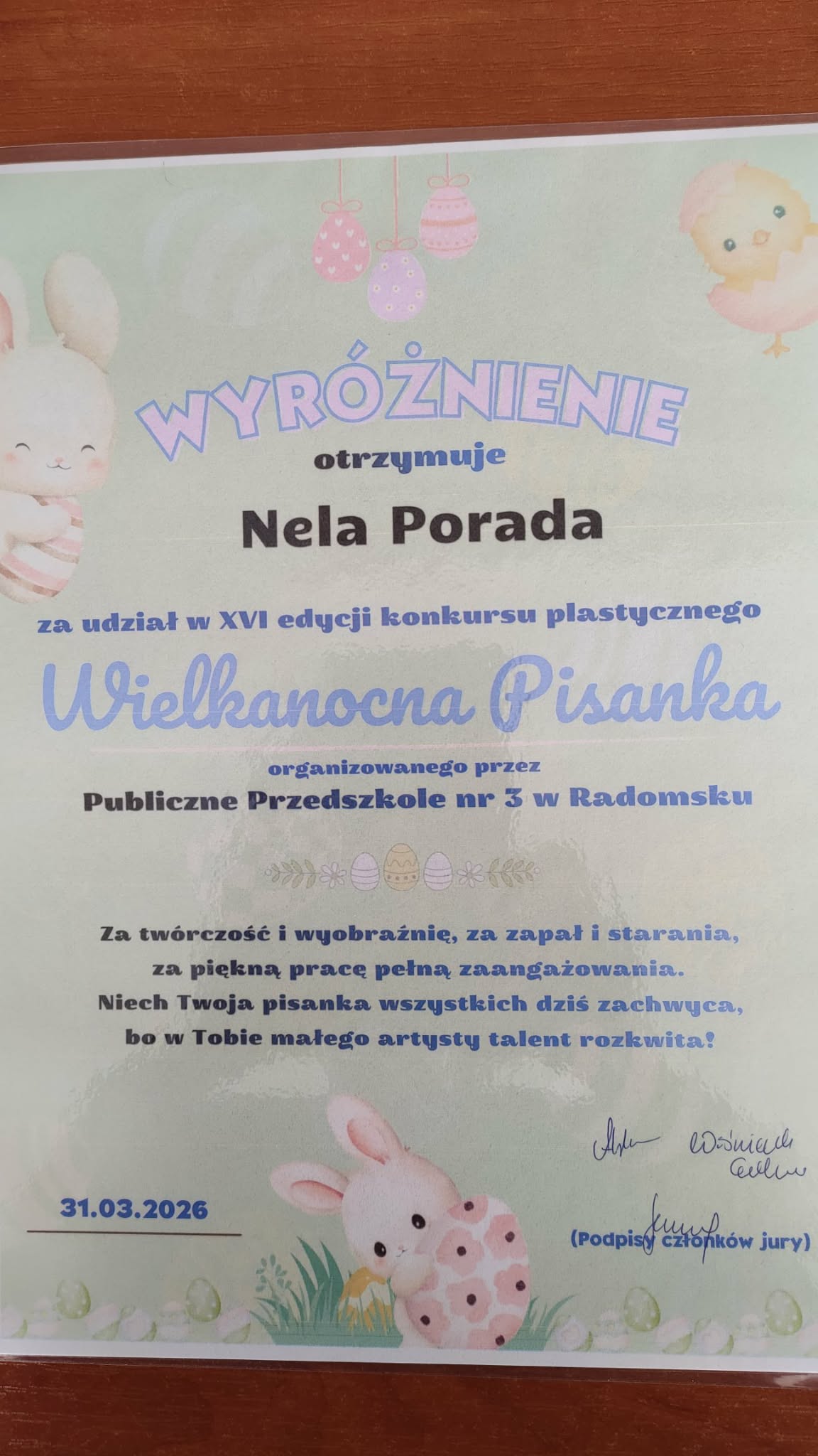 31.03.2026r. w Publicznym Przedszkolu nr 3 w Radomsku odbyła się XVI edycja konkursu plastycznego ,,Wielkanocna pisanka”, w której udział wzięła nasza Nela Porada z grupy „Motylki”. Celem wydarzenia było rozwijanie kreatywności i wyobraźni, usprawnianie zdolności manualnych oraz poznawanie tradycji wielkanocnych. Zadaniem Przedszkolaków było wyklejenie masą solną sylwety jajka oraz ozdobienie jej różnorodnymi materiałami. Wszystkie dzieci wykazały się ogromnym zaangażowaniem i talentem. Reprezentantka naszego Przedszkola otrzymała za swoje piękne jajeczko wyróżnienie oraz nagrodę rzeczową.